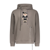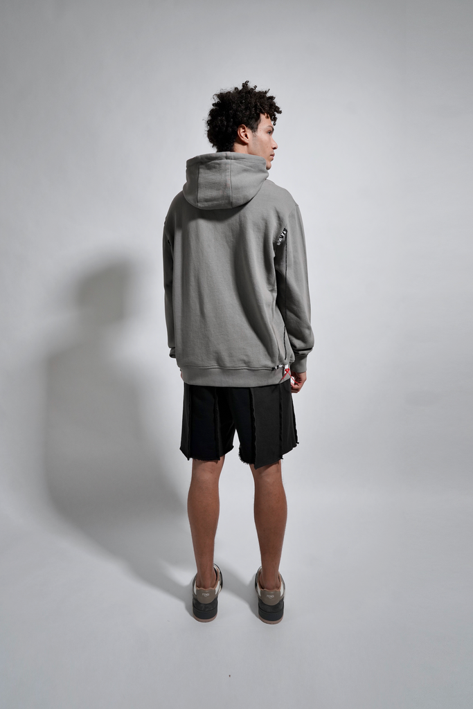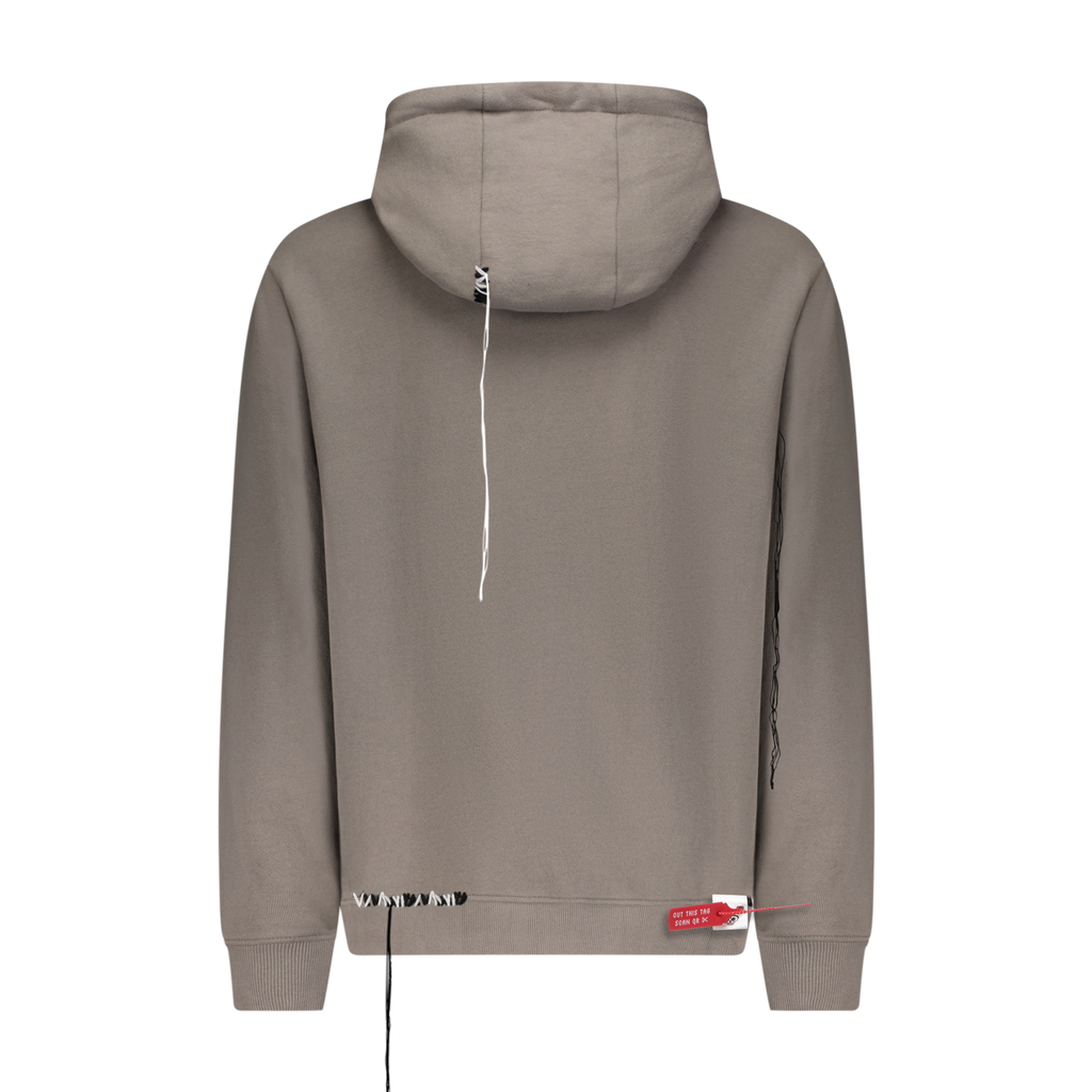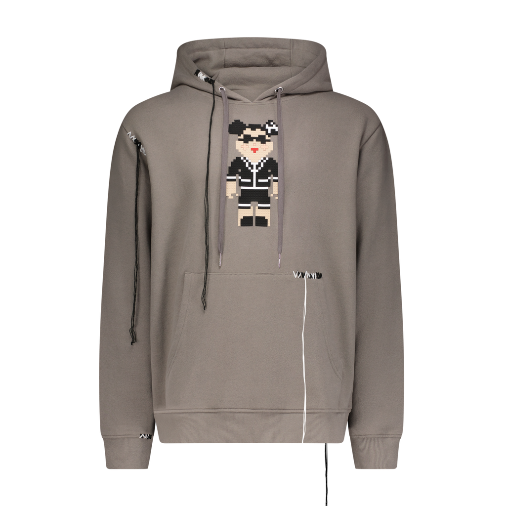 Cotton hoodie with 8-bit appliqué and scattered, deconstructed topstitch threads