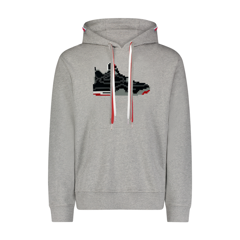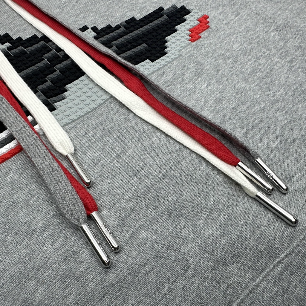 Cotton hoodie with an 8-bit applique and multiple drawcords exposed through hood tunnel