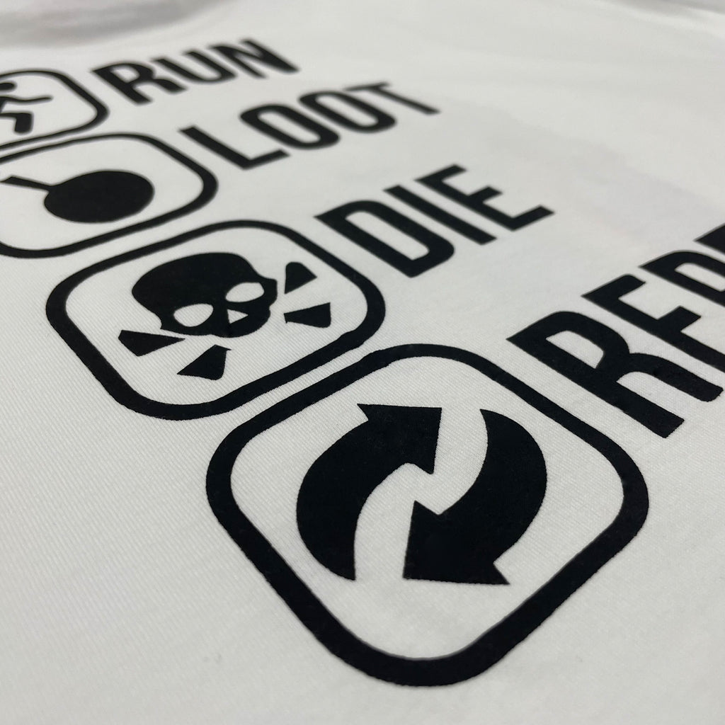 * Run, Loot, Die, Repeat screen print on back