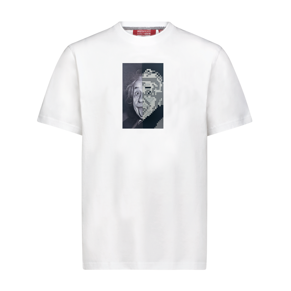 Cotton T-shirt with photo transfer print layered with an "8-Bit" appliqué at chest