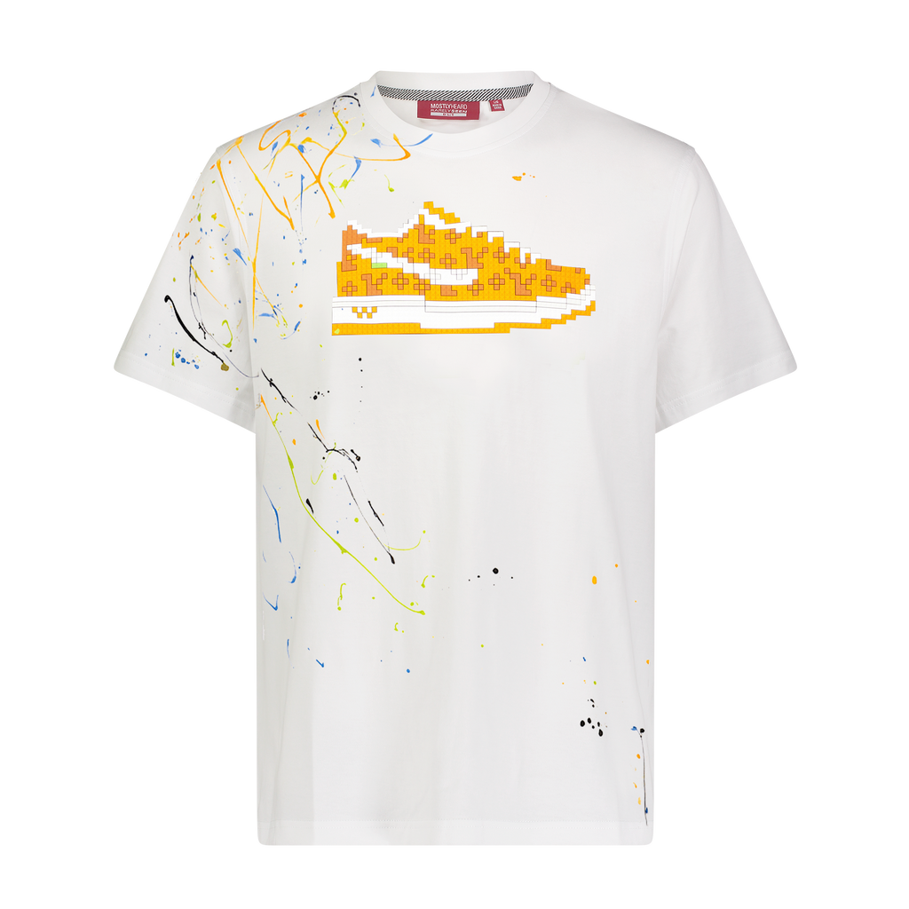 Short sleeve cotton jersey T-shirt. Signature "8-Bit" pixelated silicone appliqué at chest and artisanal hand-painted finish
