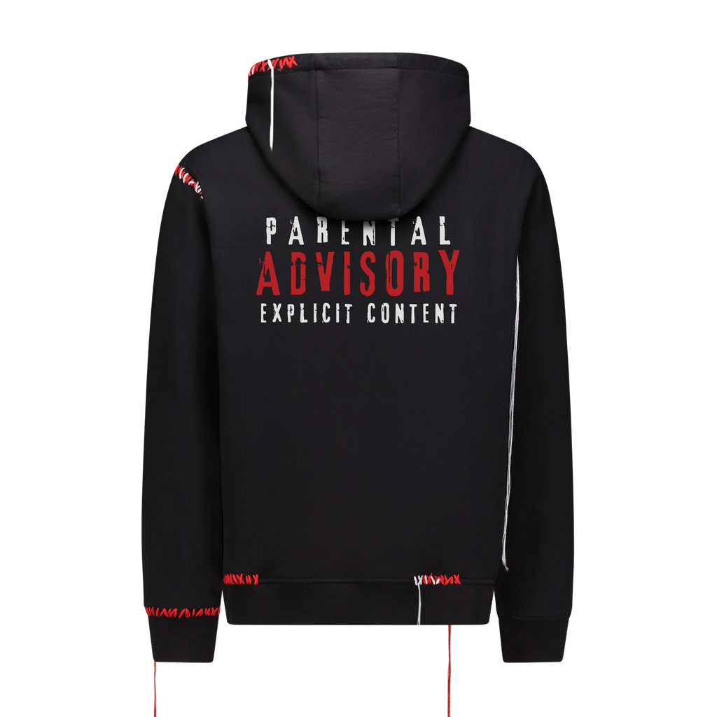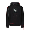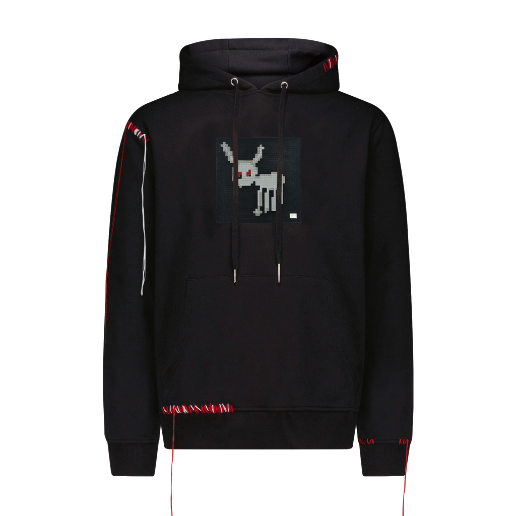 Cotton hoodie with an 8-bit applique, screen print and scattered, deconstructed topstitch threads