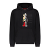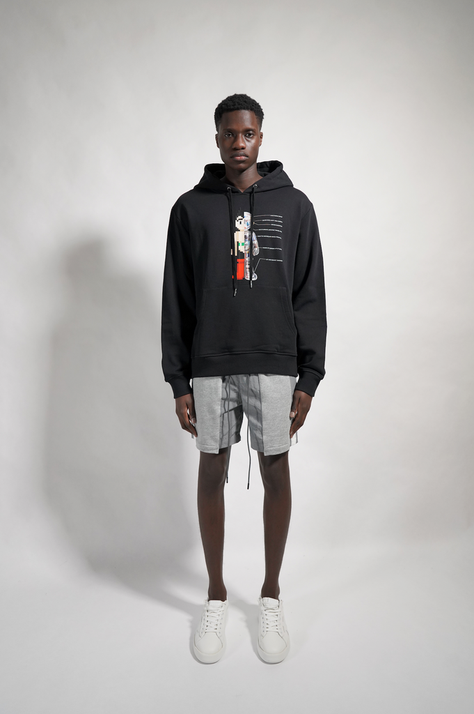 Cotton hoodie with photo transfer layered with an 8-bit applique
