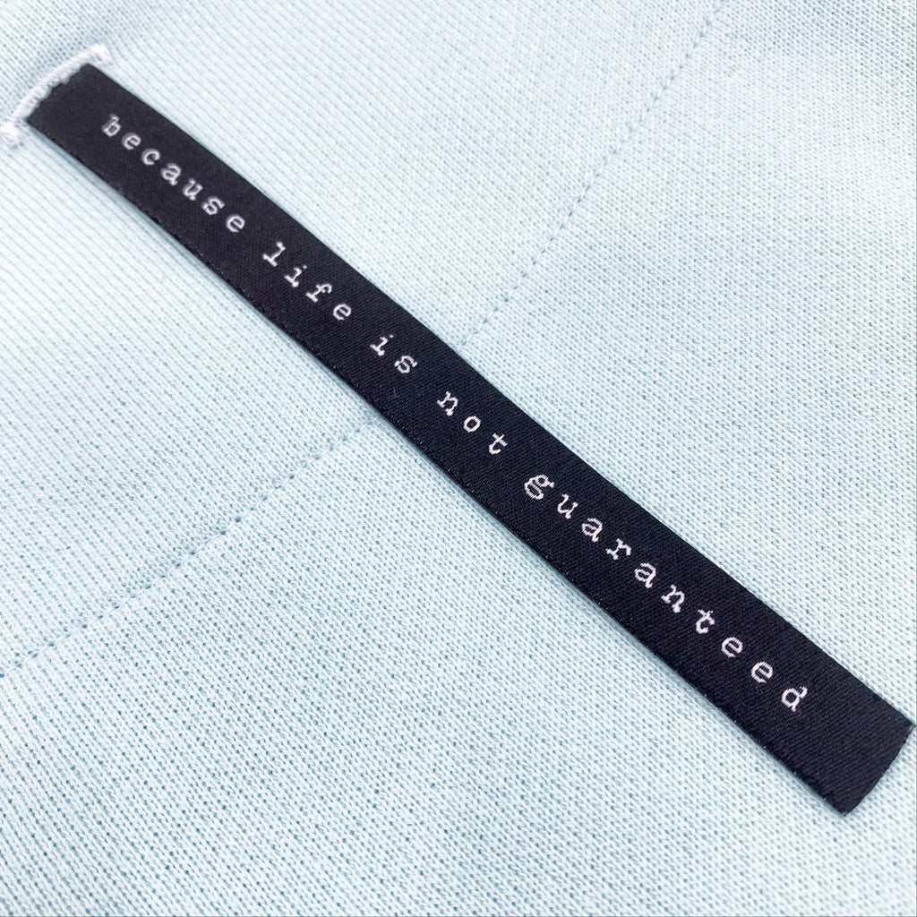 * "because life is not guaranteed" double woven label detail is exposed through button hole underneath hood