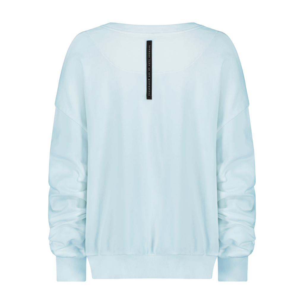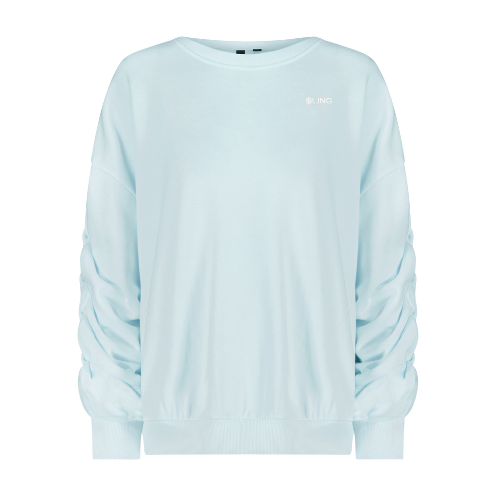 Cotton mint blue oversized crewneck with the iconic B.L.I.N.G logo in a dirct embroidery across the wearers front left chest and sinched sleeves