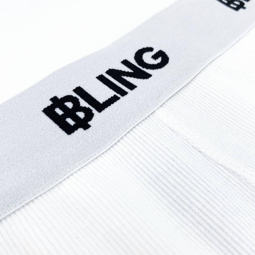 * Custom white and black B.L.I.N.G. jacquarded waistband