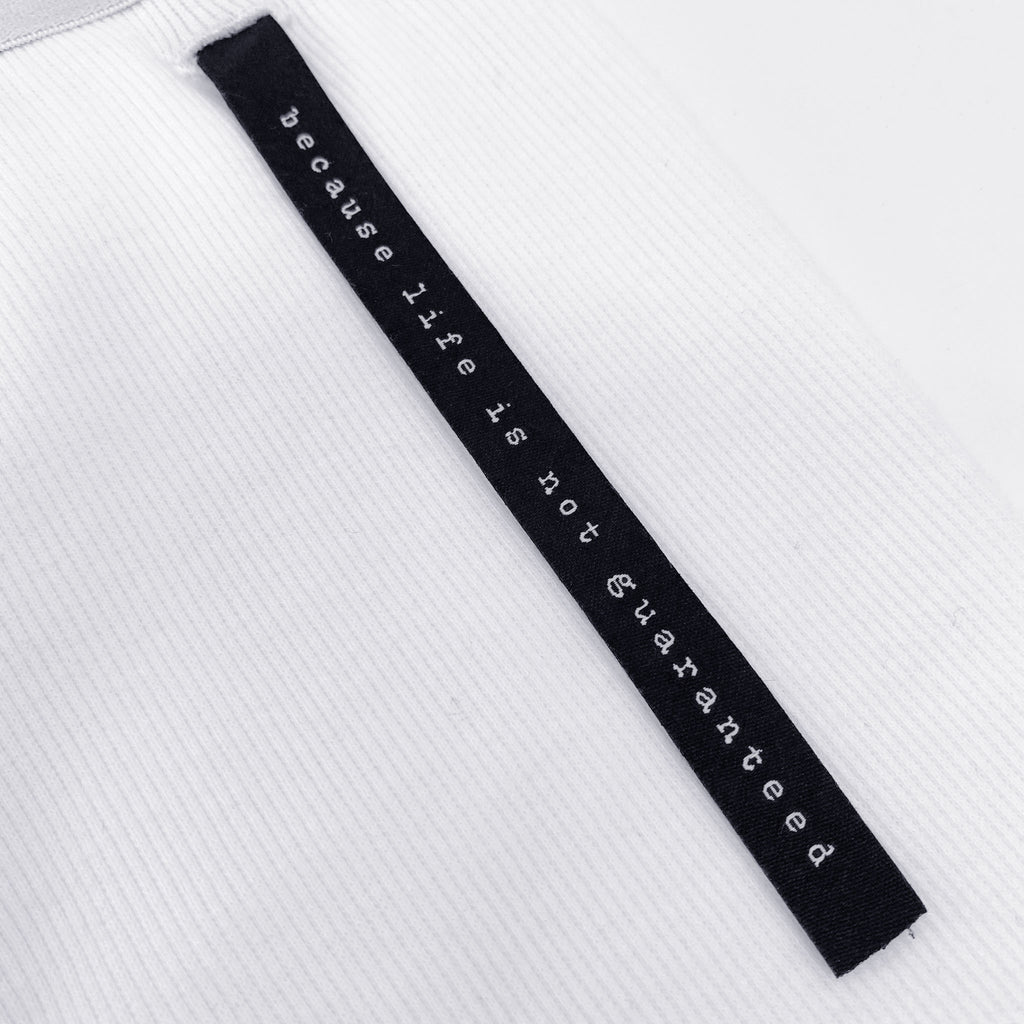* "because life is not guaranteed" double woven label detail is exposed through button hole on back right side of garment