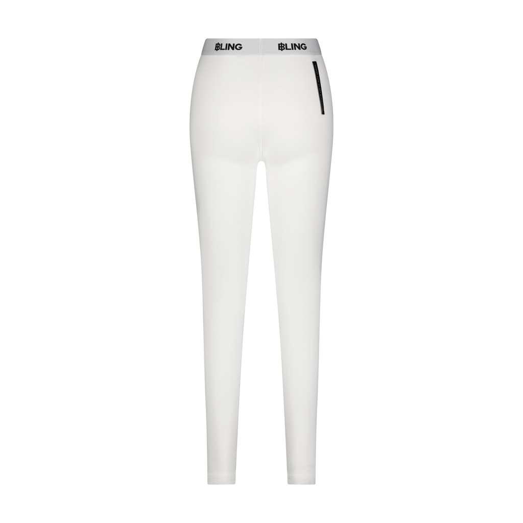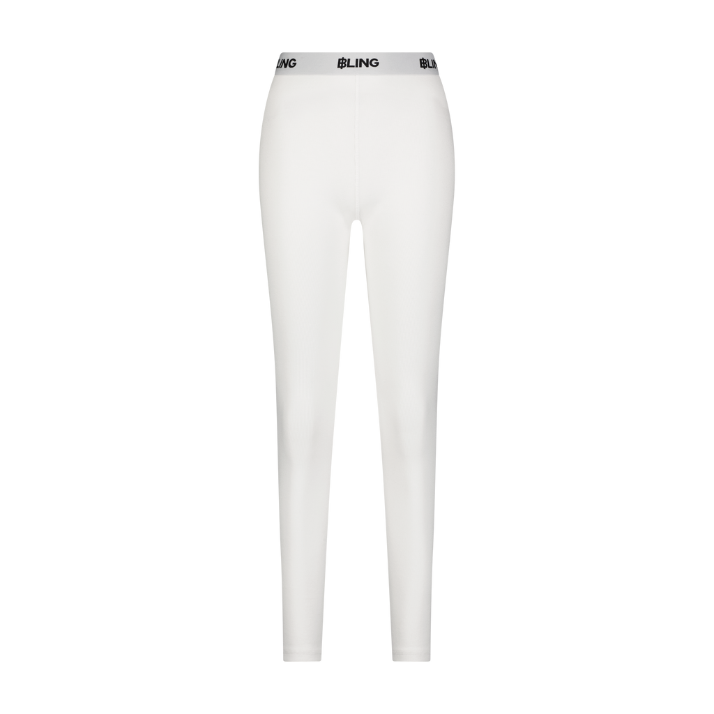 Cotton ribbed off white leggings with custom B.L.I.N.G jacquard trim at waistband