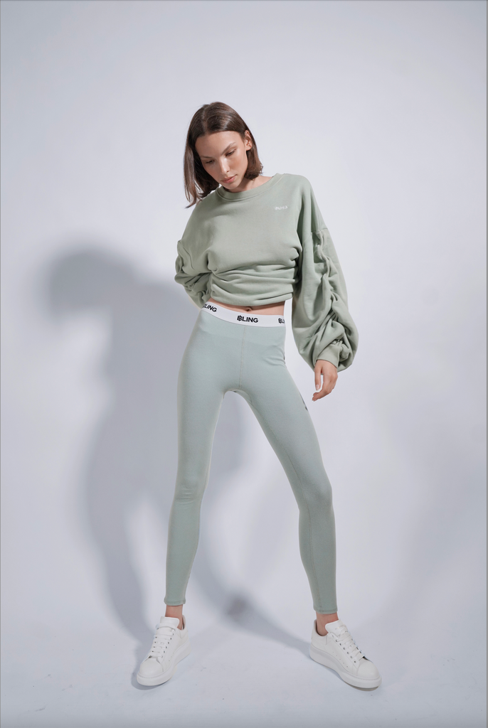 "BLING" OVERSIZED CREWNECK-Cotton seafoam green oversized crewneck with the iconic B.L.I.N.G logo in a dirct embroidery across the wearers front left chest and sinched sleeves
