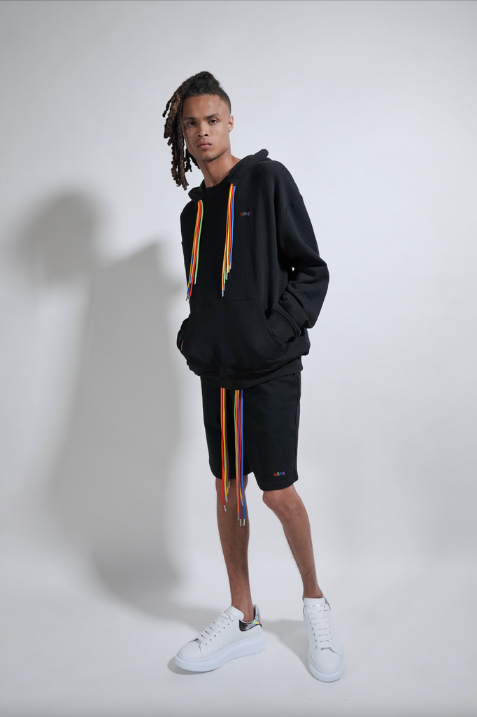 "BLING PRISM" HOODIE-Cotton Black hoodie with the iconic B.L.I.N.G logo in multi prism colored direct embroidery on the wearers left chest and 6 prism colored drawstrings coming from hood tunnel.