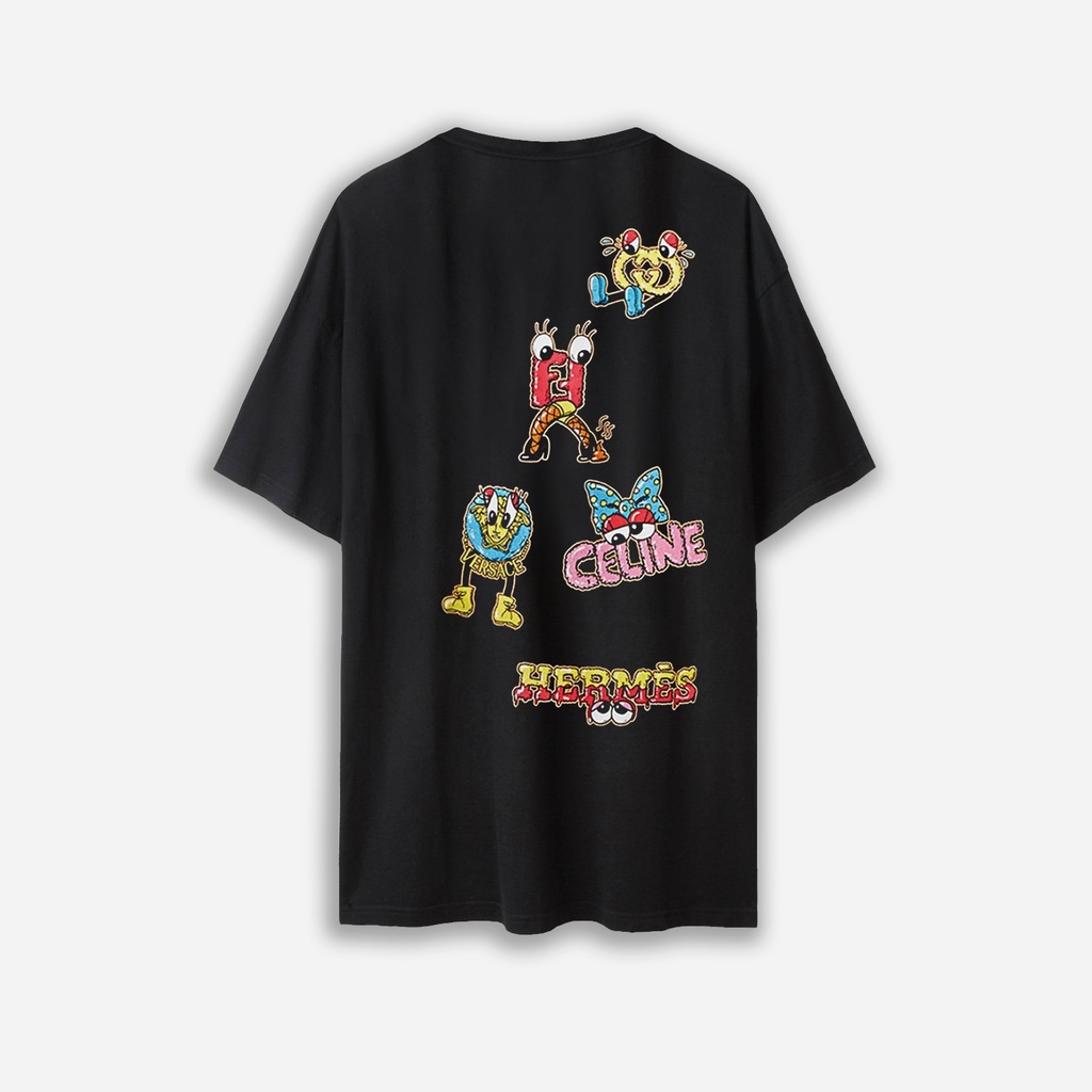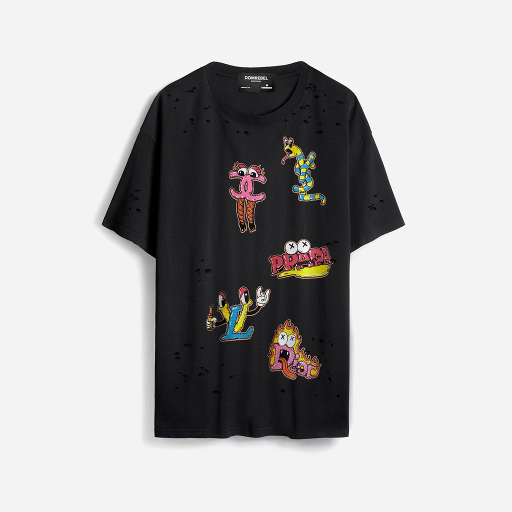 Short sleeve cotton jersey T-shirt. DOMREBEL printed artwork of luxury brands turned into cartoon monsters. DOMREBEL artwork printed on back.