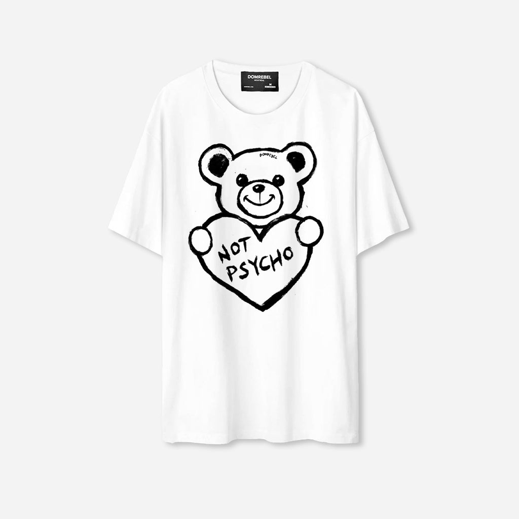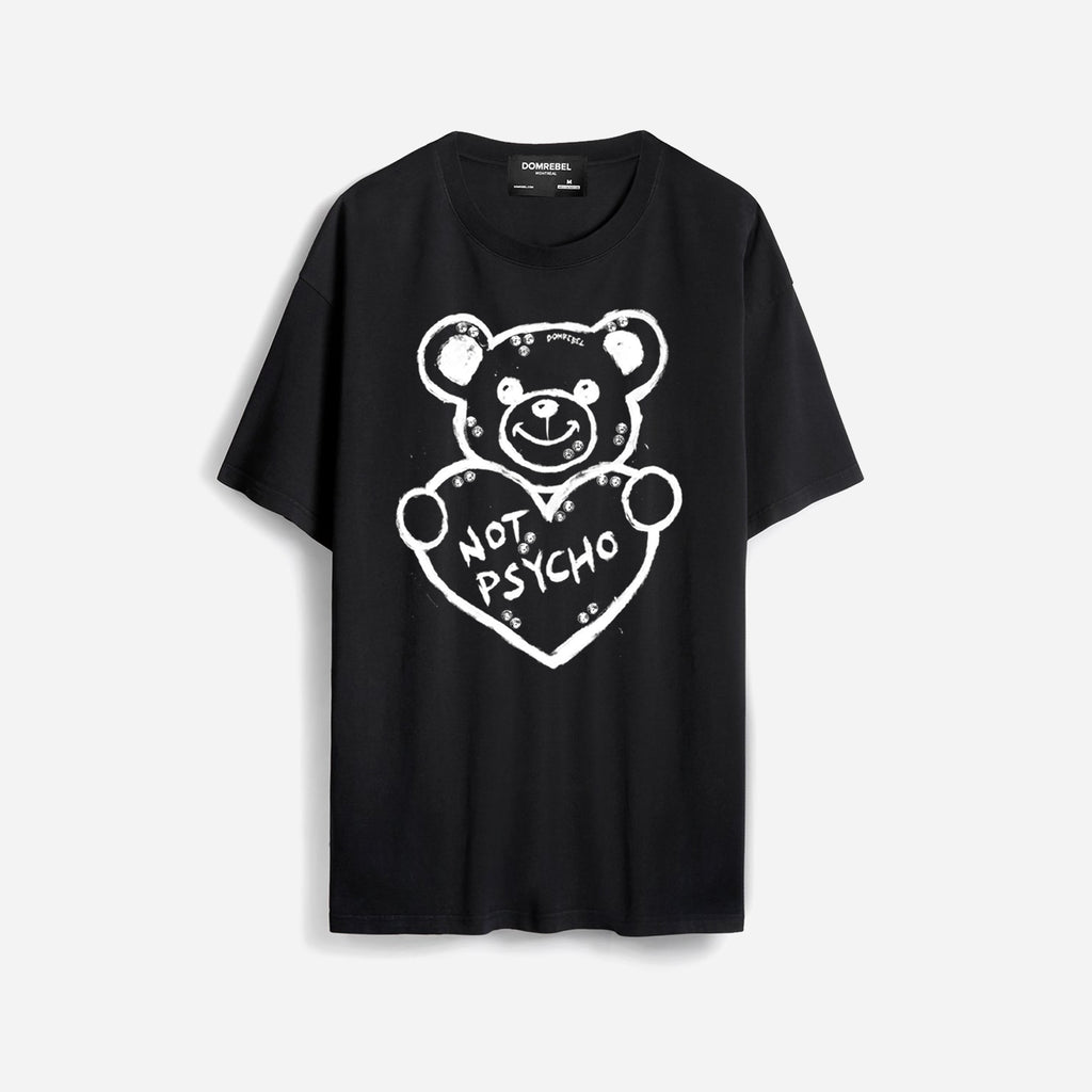 Short sleeve cotton jersey T-shirt. DOMREBEL printed artwork of teddy bear holding a heart that says “NOT PSYCHO”. DOMREBEL artwork printed on back.
