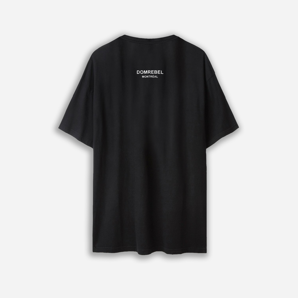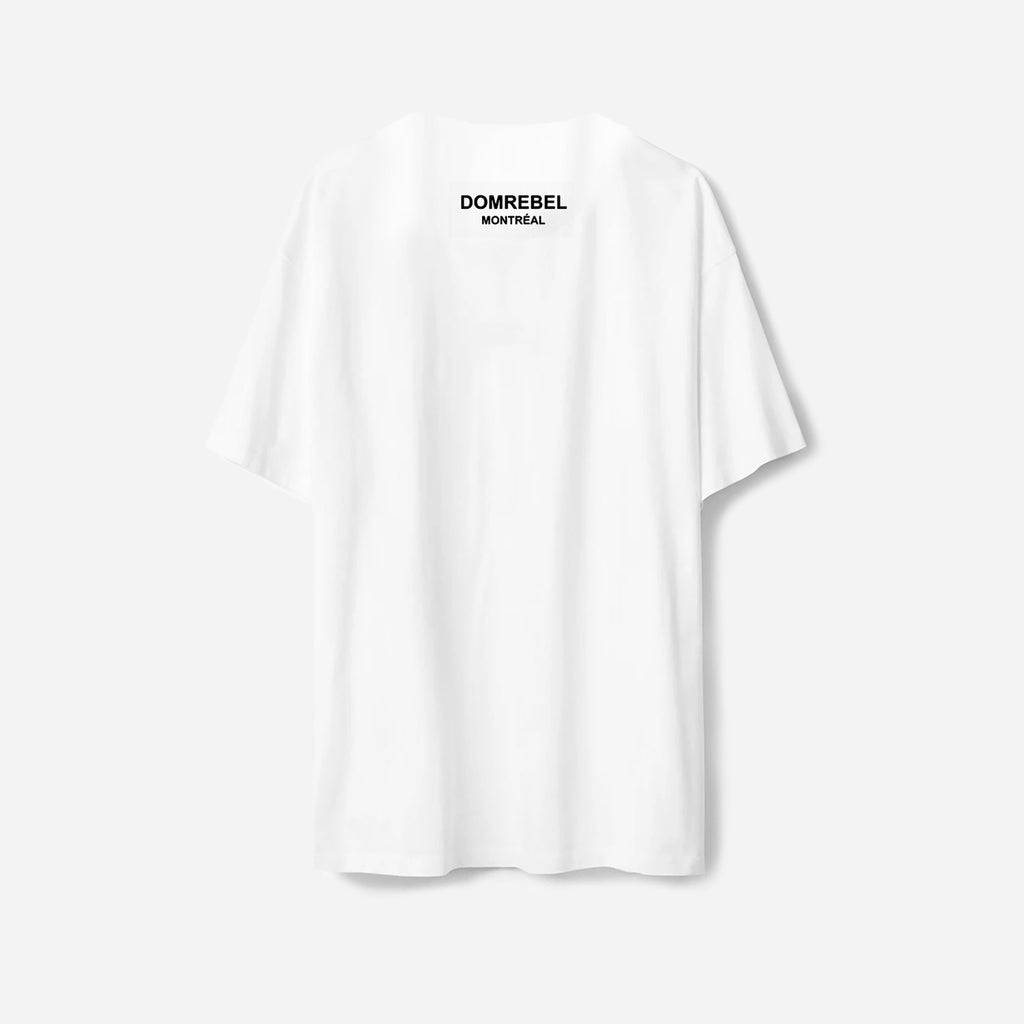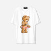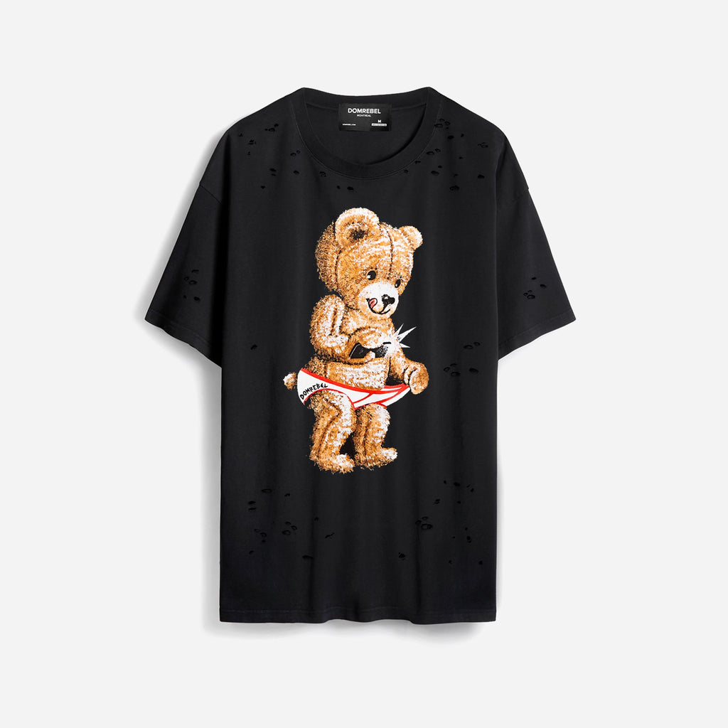 Short sleeve cotton jersey T-shirt. DOMREBEL printed artwork of a teddy bear discreetly taking a dick pic. DOMREBEL artwork printed on back.