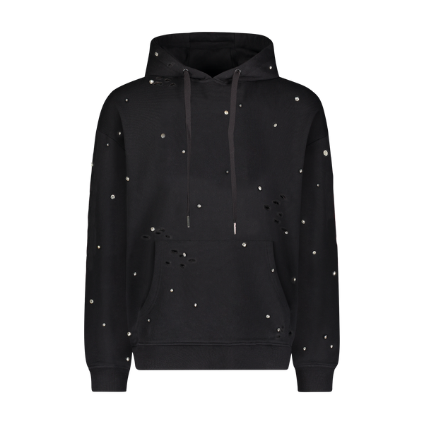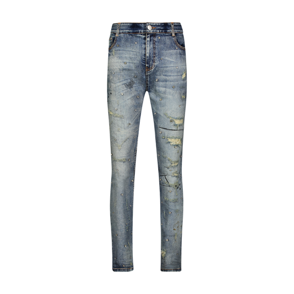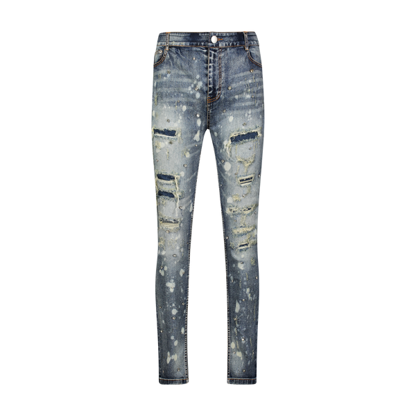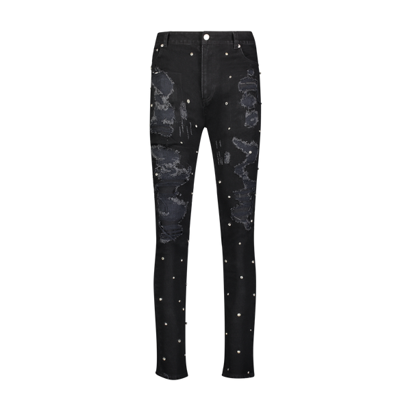 Artisanal hand-made denim collection. Fabricated using high stretch Japanese Kaihara Denim from Okayama, Japan. Hand finished: sanding, destruction, repair stitches, with constellation hand-setting of cubic-zirconia crystal stones in 3 different sizes.