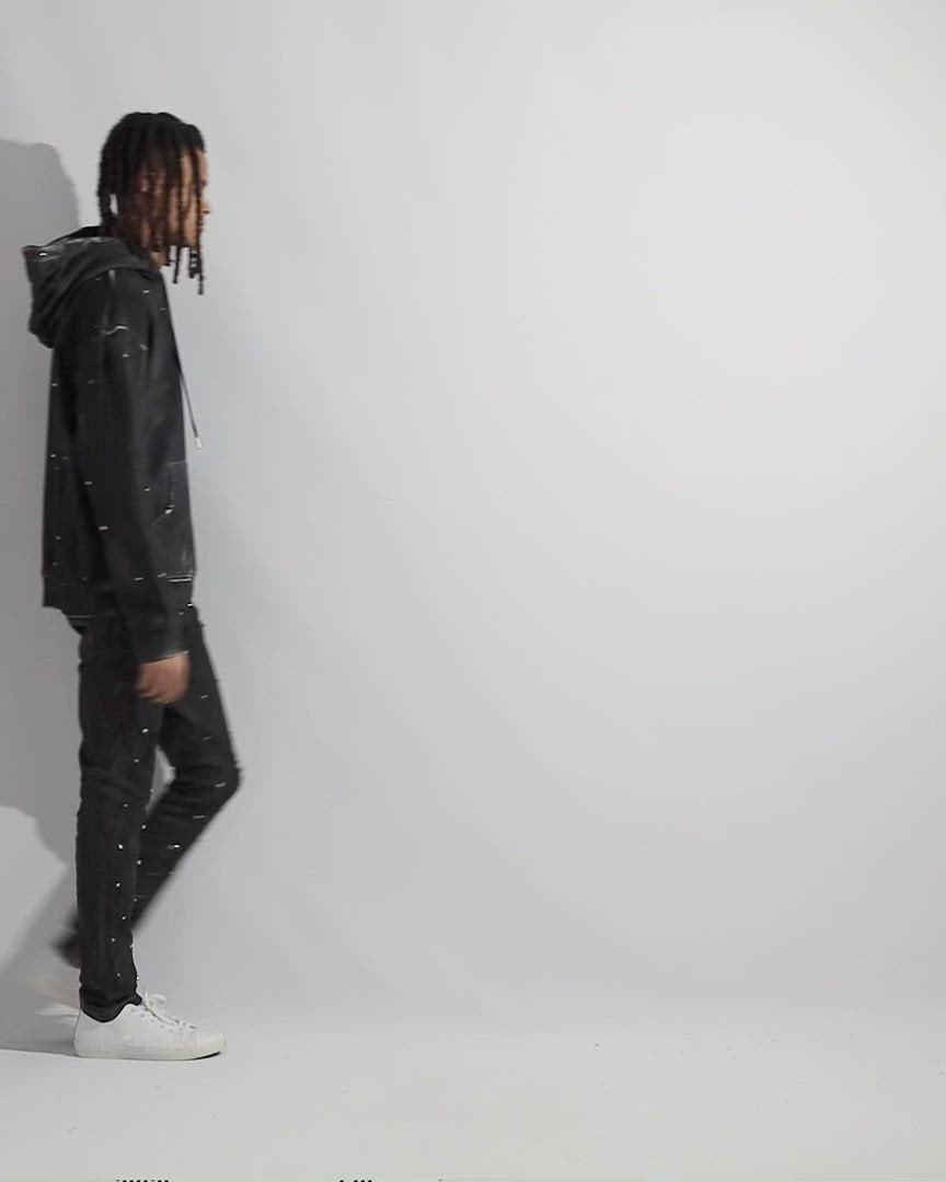 GMC02BB-J06S "SHADOW" JEAN White washed Japanese Kaihara stretch denim. Hand finished spray dyed black, with acid rinse wash with hand distressed details and hand set Austrian cubic zirconia diamond-cut crystals.