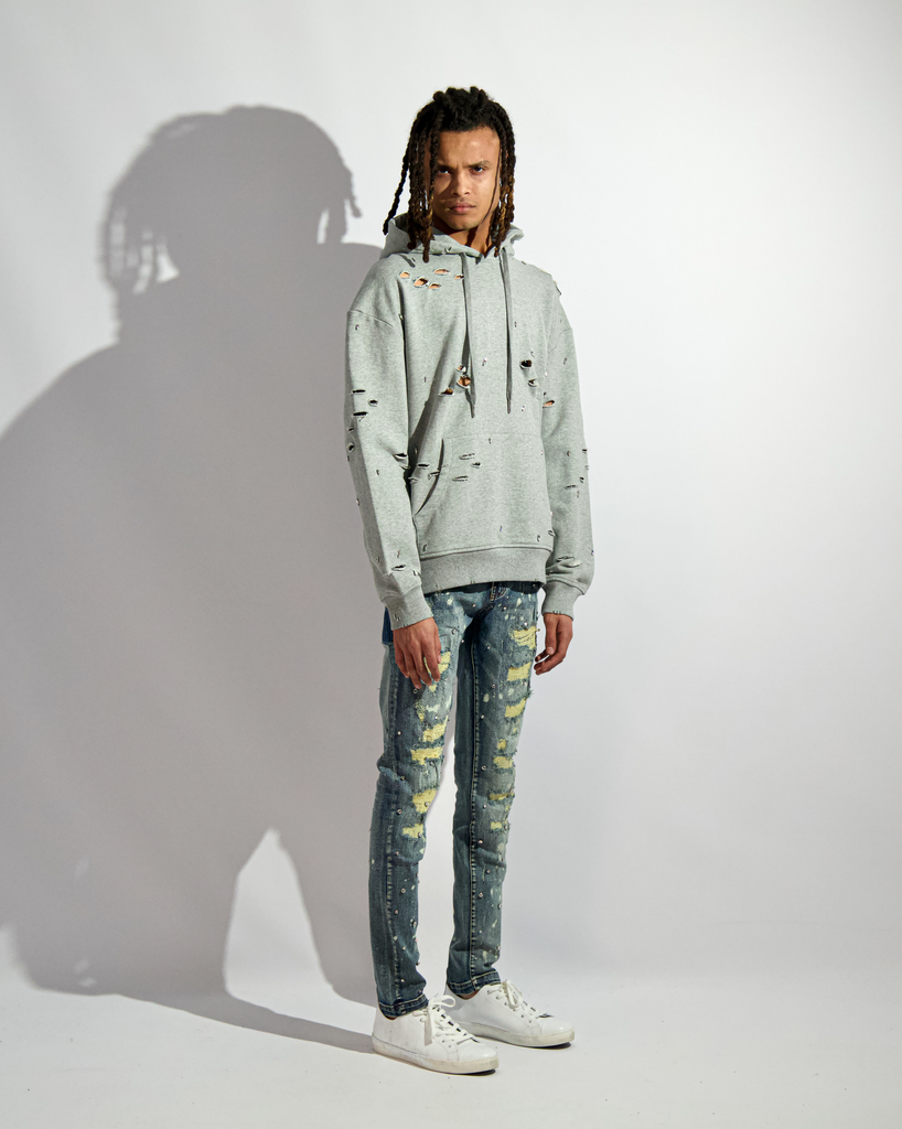 GMC08BB-KHS01 "RAINDROP" HOODIE Cotton french terry oversized drop shoulder hoodie with custom hand done rips and hand set raindrop Austrian cubic zirconia diamond-cut crystals