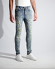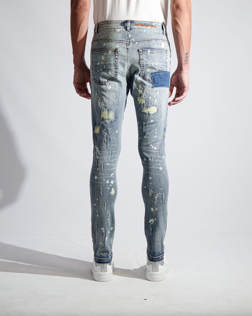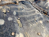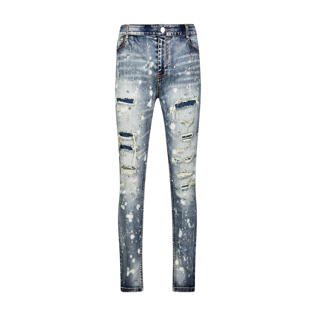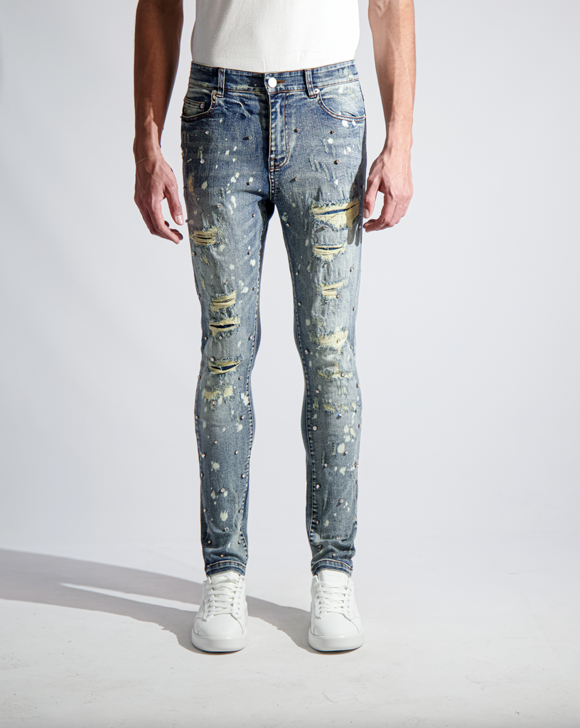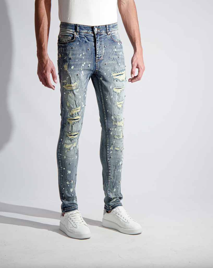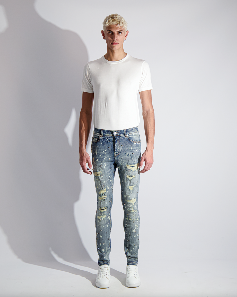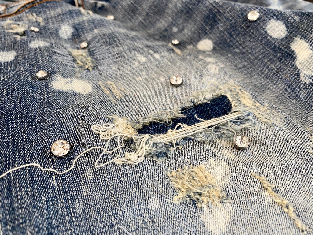 Light blue vintage washed Japanese Kaihara stretch denim. Hand distressed, ripped, reworked and hand set Austrian cubic zirconia diamond-cut crystals.