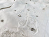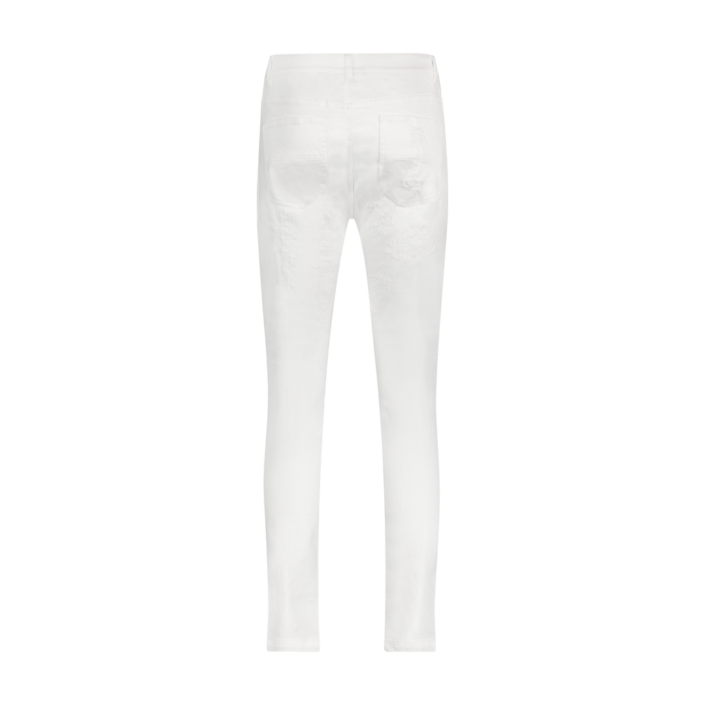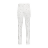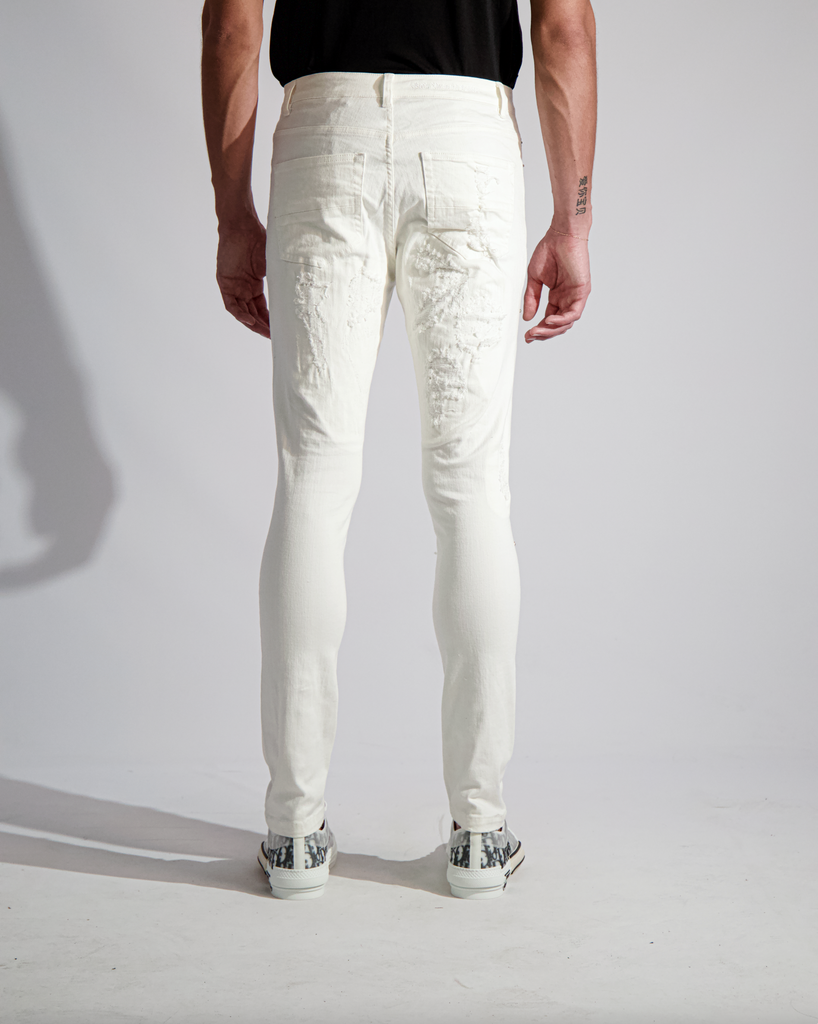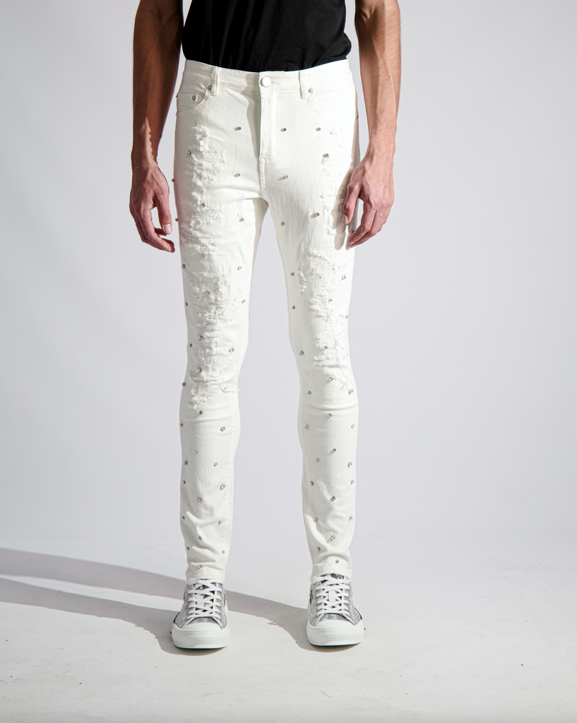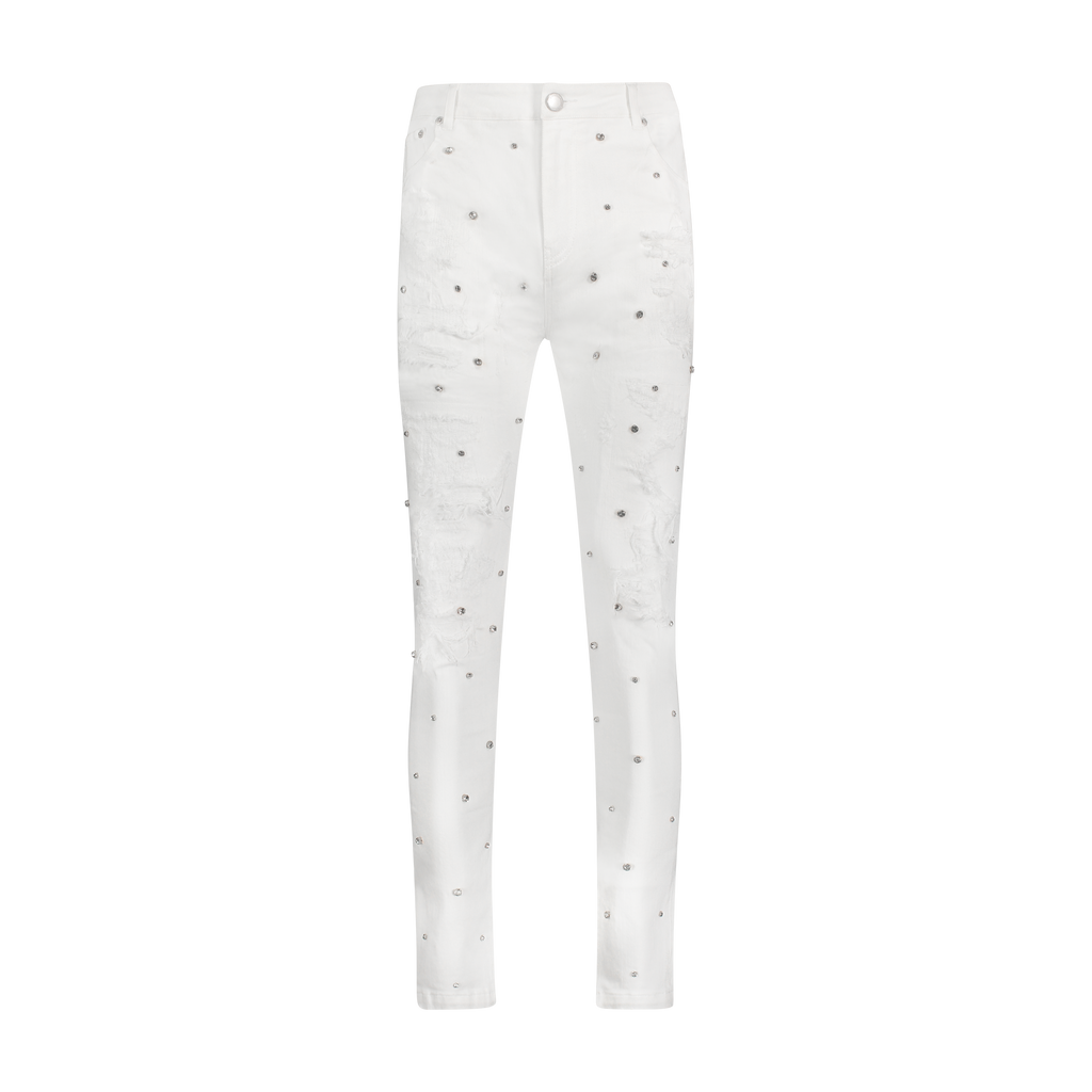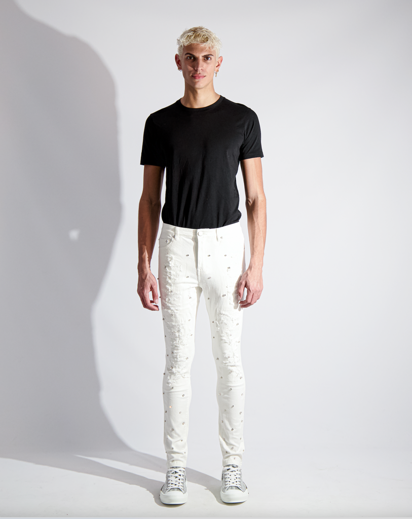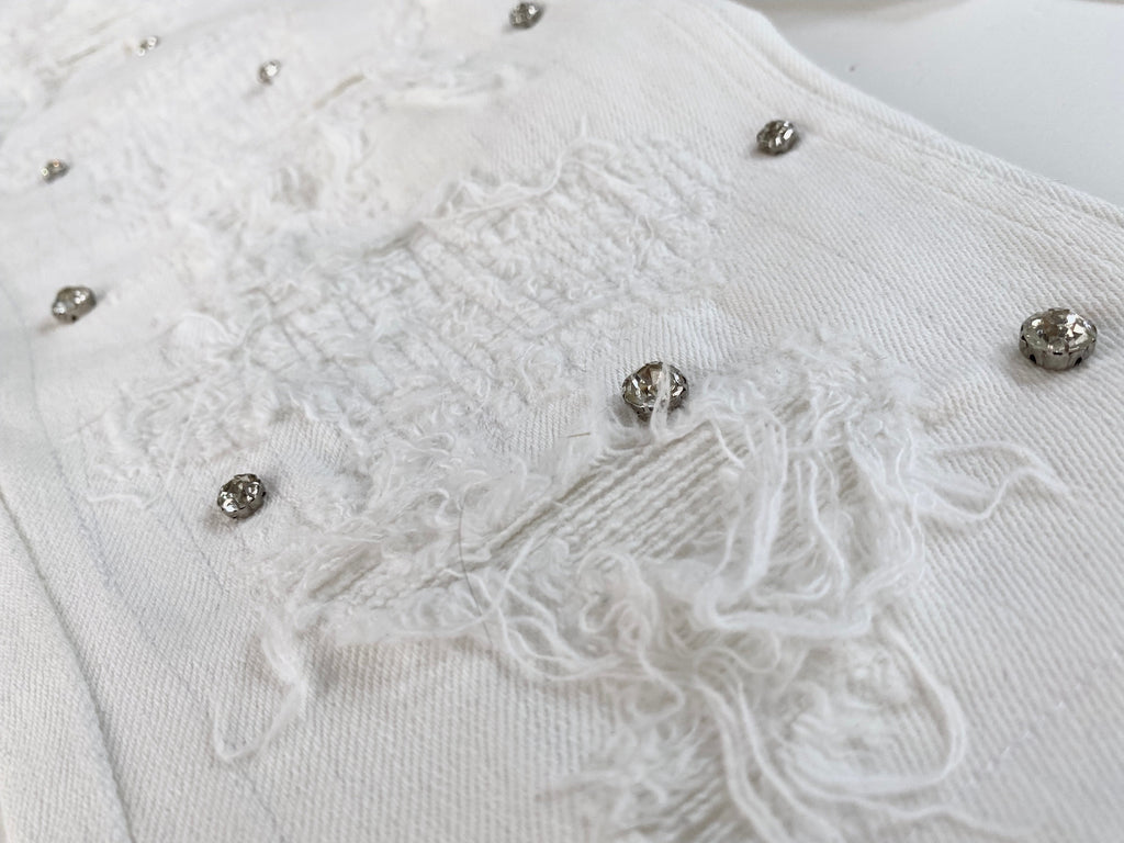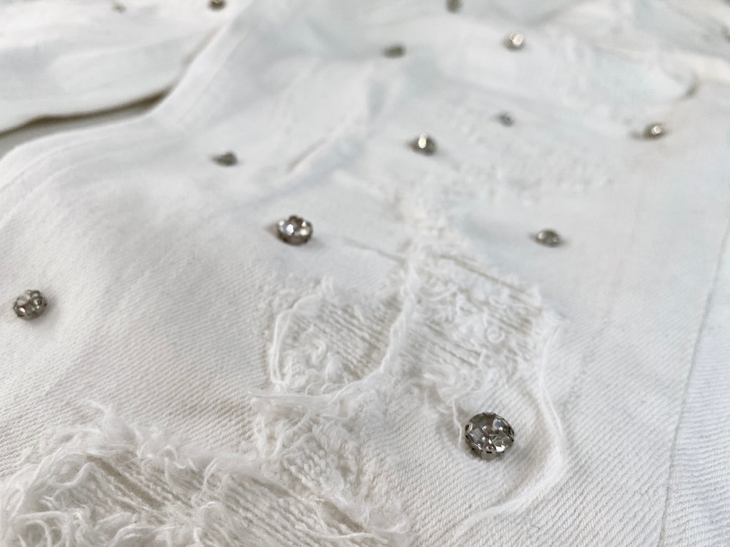 White washed Japanese Kaihara stretch denim. Hand distressed, ripped, reworked and hand set Austrian cubic zirconia diamond-cut crystals.