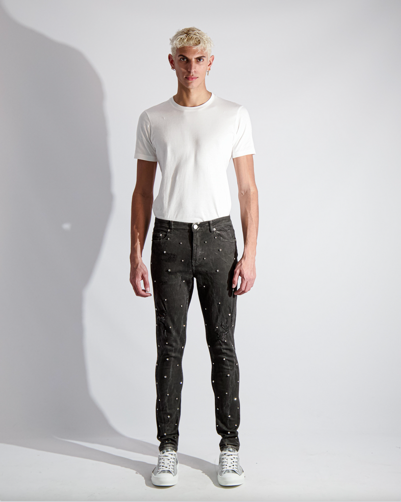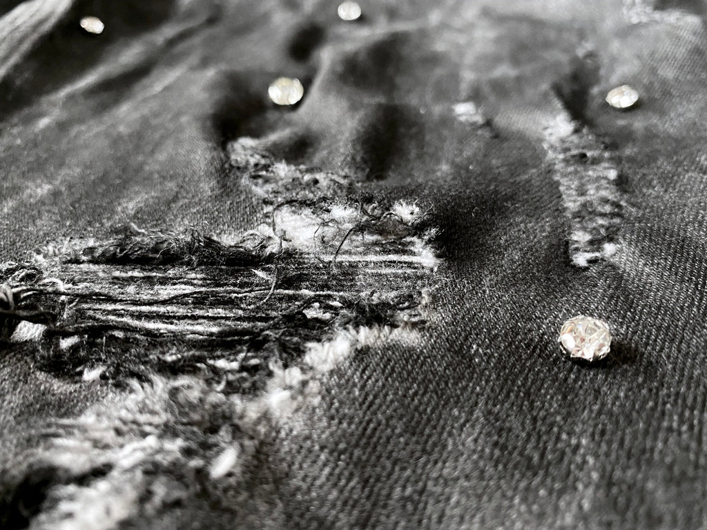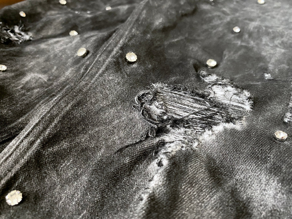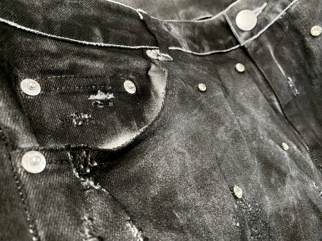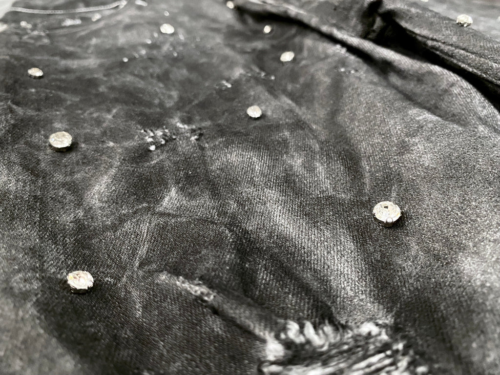 White washed Japanese Kaihara stretch denim. Hand finished spray dyed black, with acid rinse wash with hand distressed details and hand set Austrian cubic zirconia diamond-cut crystals.