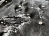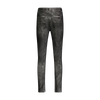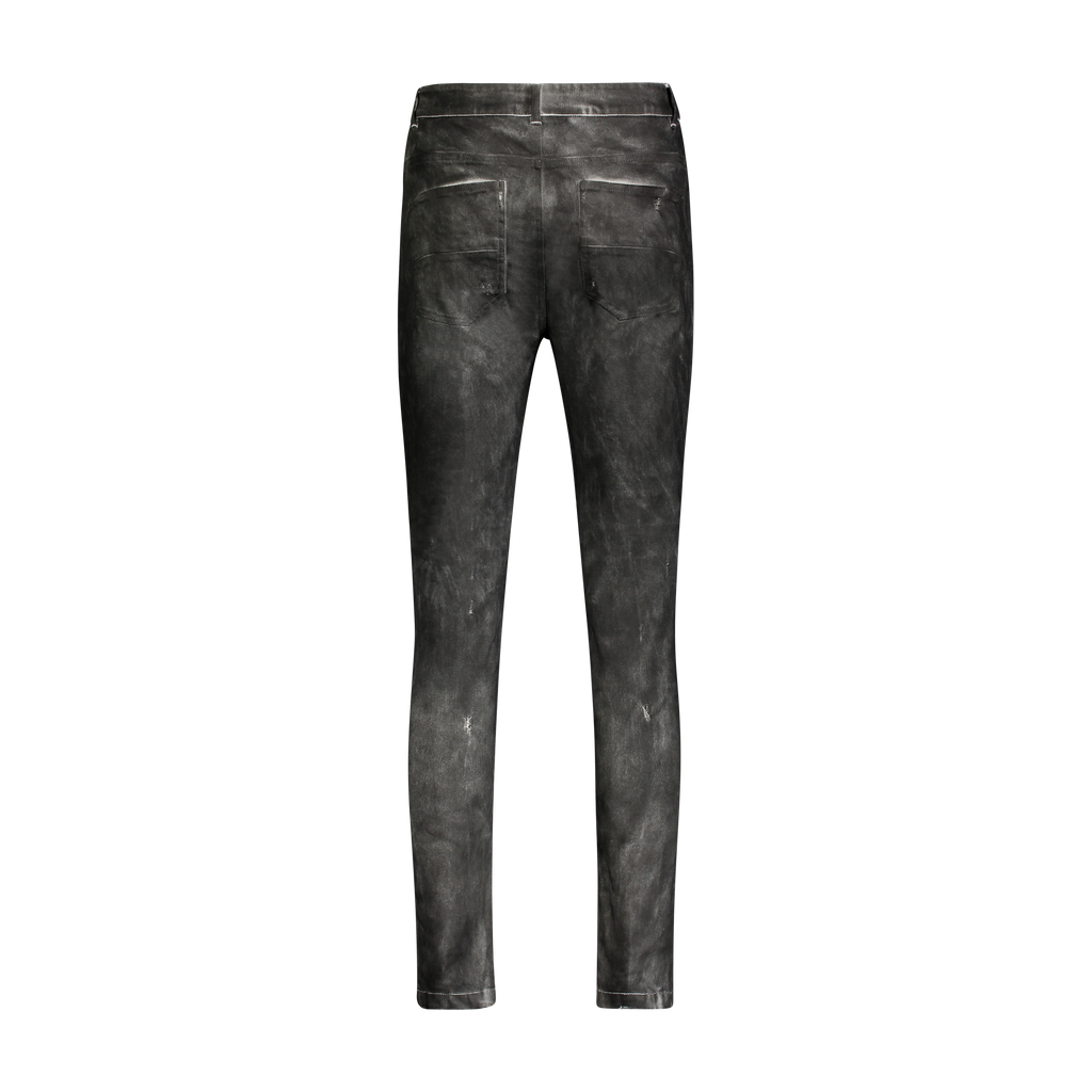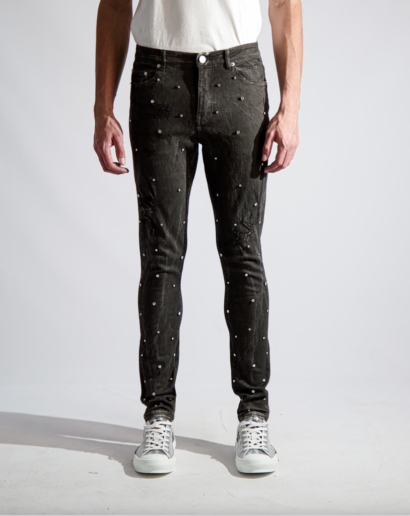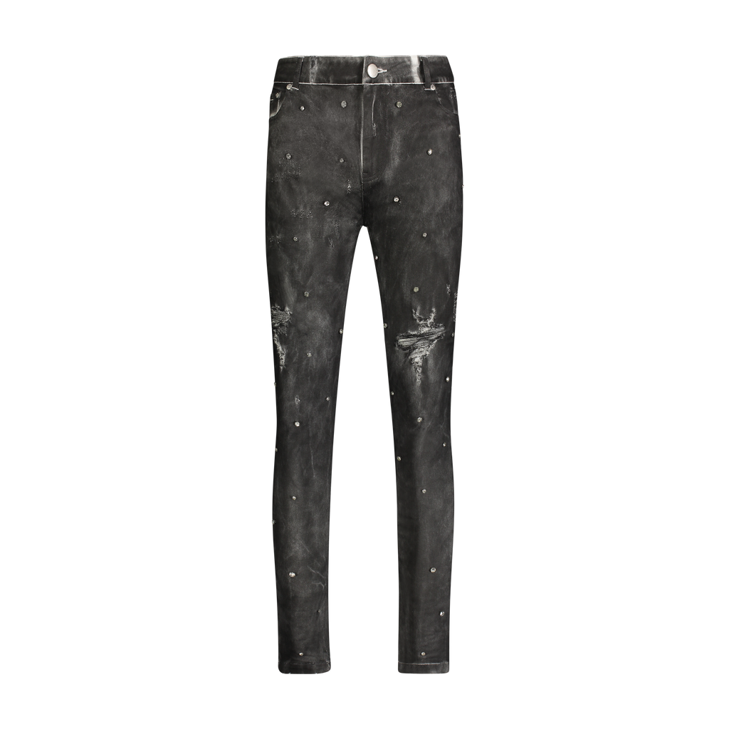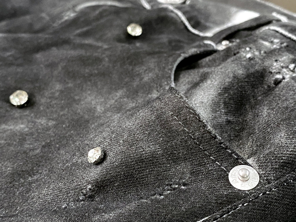 White washed Japanese Kaihara stretch denim. Hand finished spray dyed black, with acid rinse wash with hand distressed details and hand set Austrian cubic zirconia diamond-cut crystals.