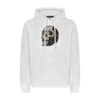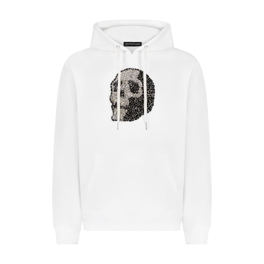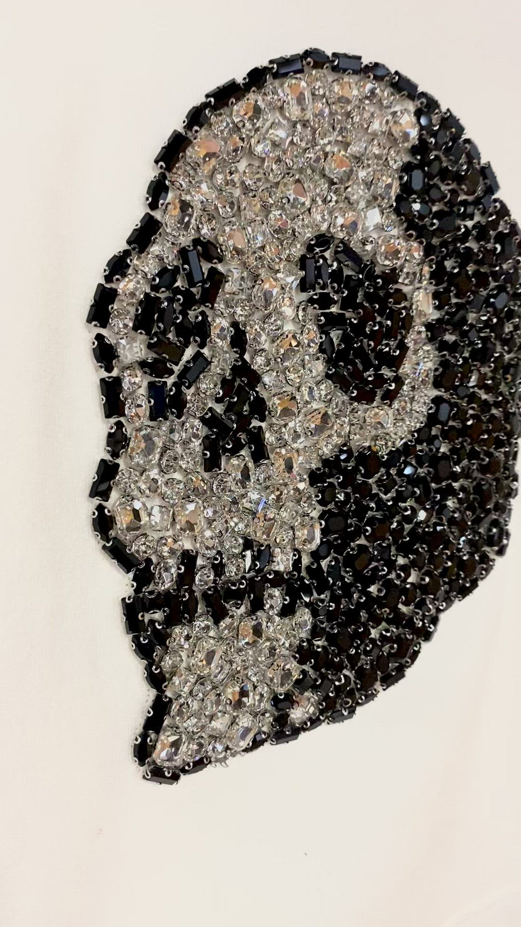 Cotton french terry oversized drop shoulder hoodie with a custom hand set Austrian cubic zirconia diamond-cut crystals in White, Black Diamond, and Jet Black to create a skull graphic