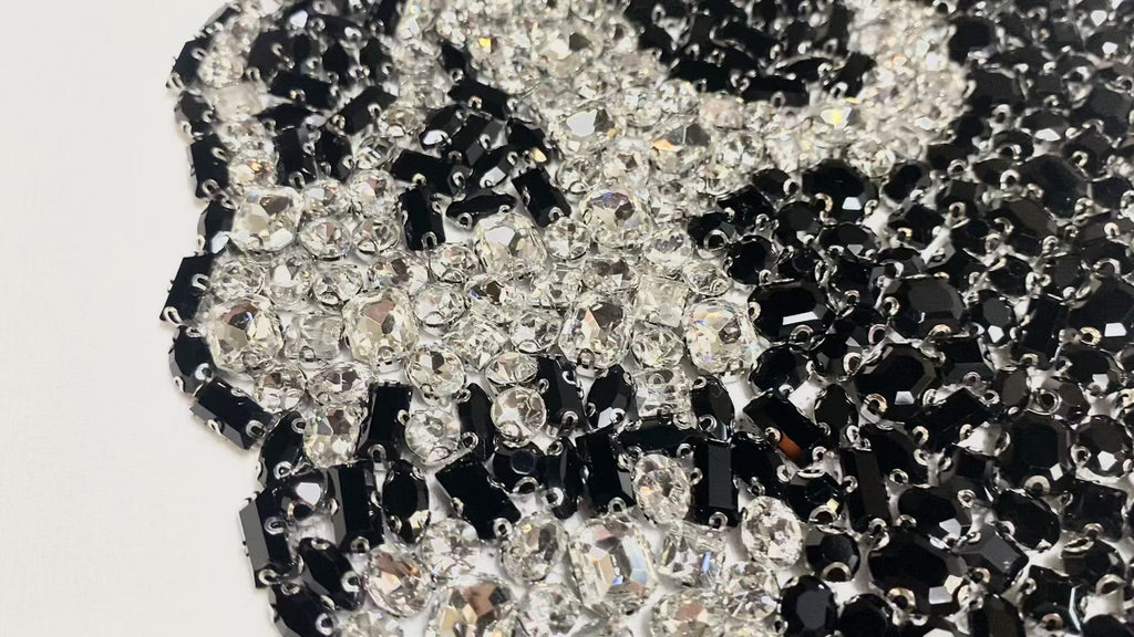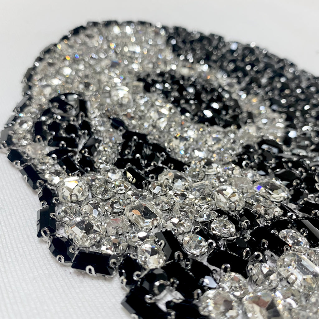 * Hand set Austrian cubic zirconia diamond-cut crystals to create a skull graphic