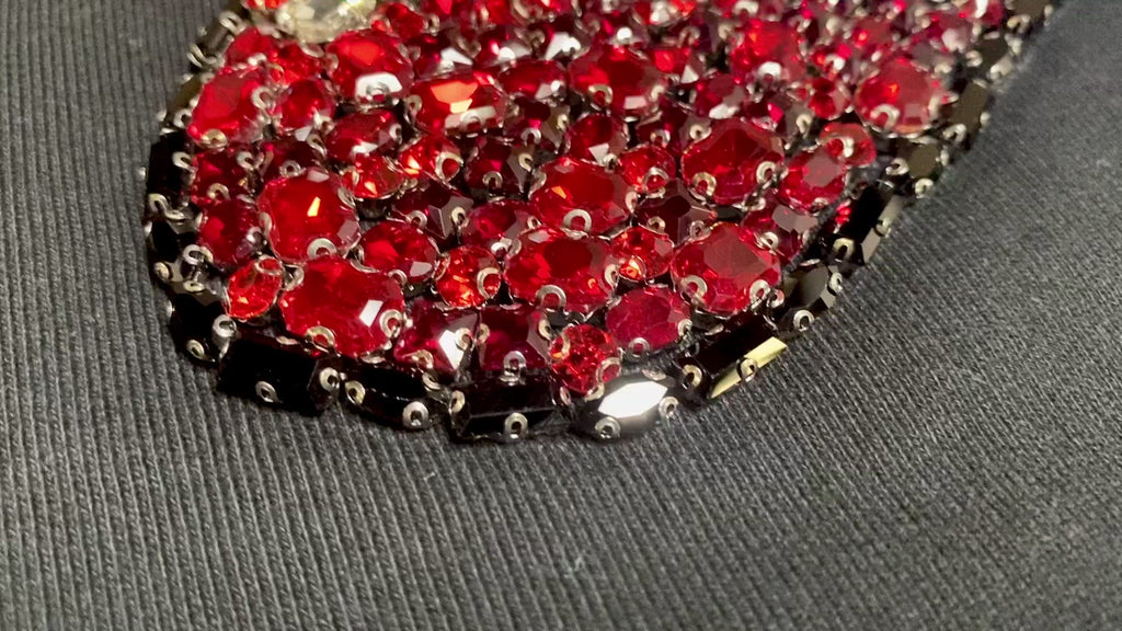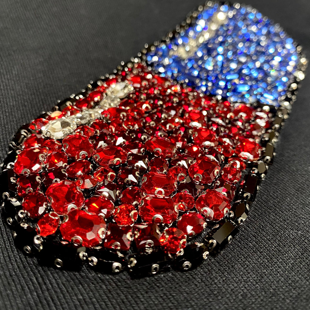 * Hand set Austrian cubic zirconia diamond-cut crystals to create a pill graphic
