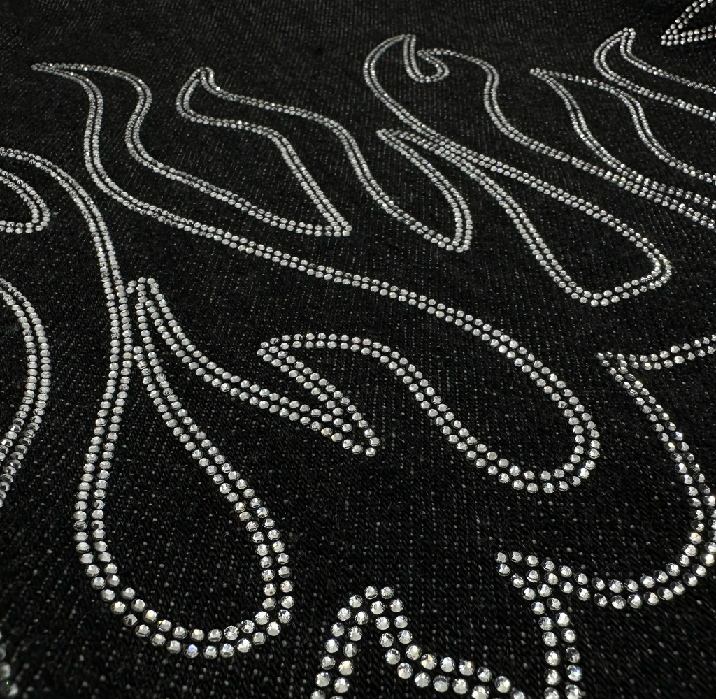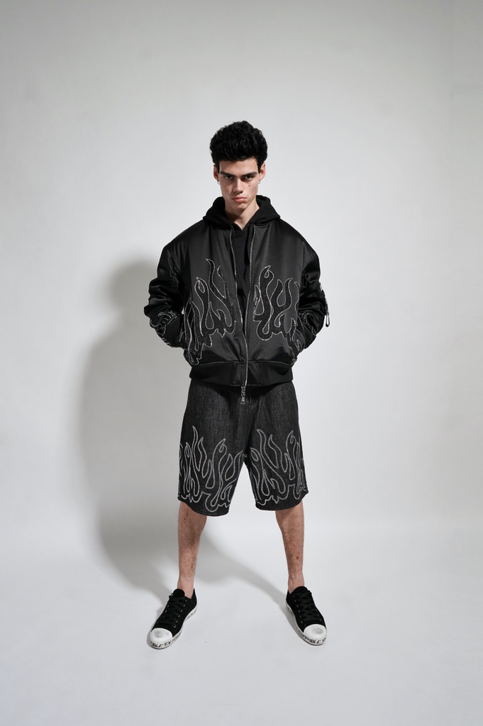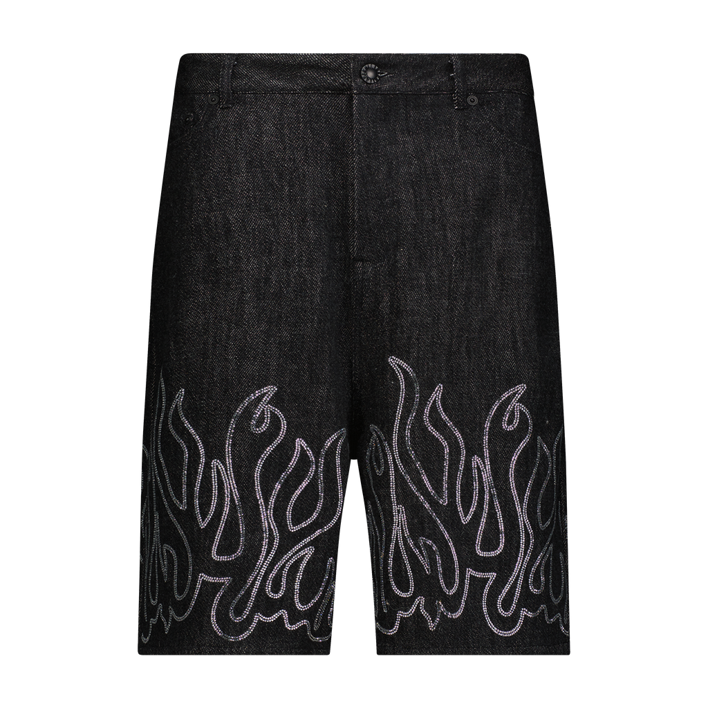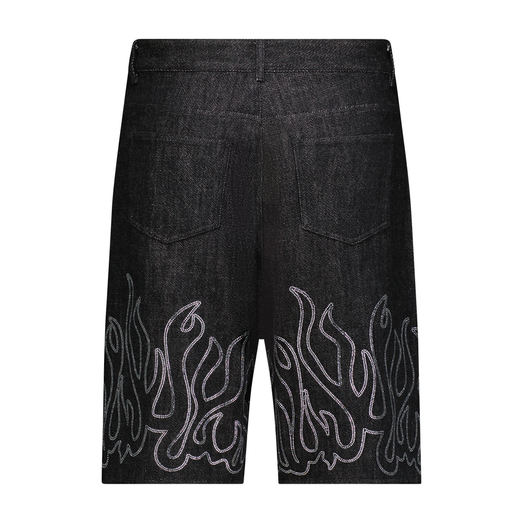 Black bugle cotton loose fitted denim shorts with white crystal stoned original Harif Guzman flame along the hem of the short