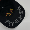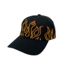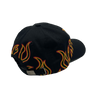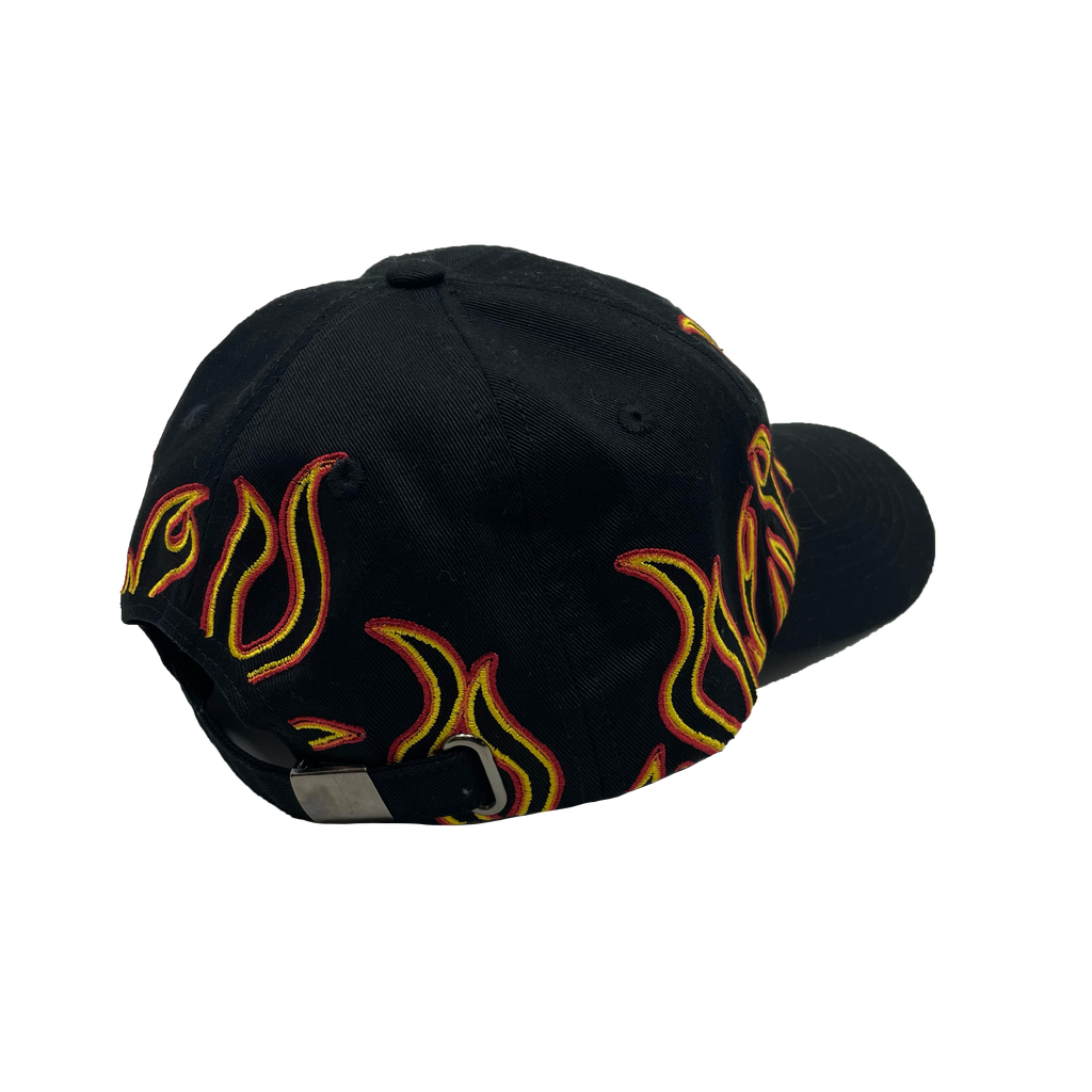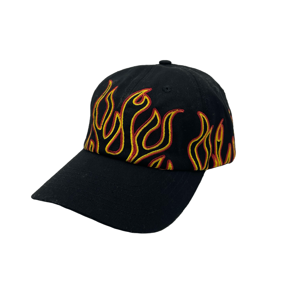 Black cotton twill dad hat with a red, orange and yellow thin line embroidery flame around the whole hat