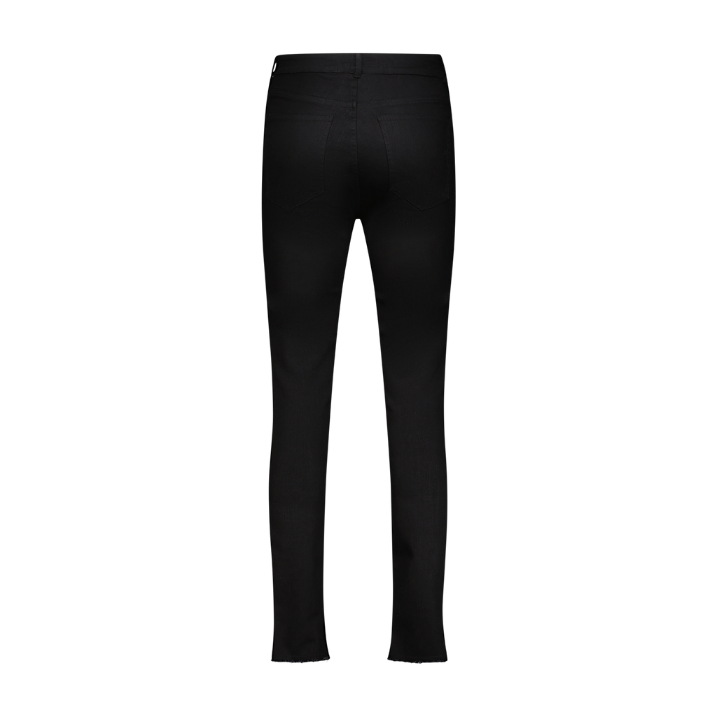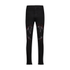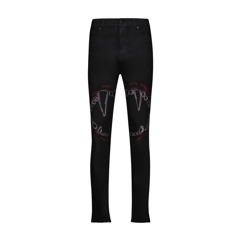 Black stretch cotton denim slim fit jeans with jet black, white crystal and siam (red) stoned Fang Lips on the front
