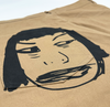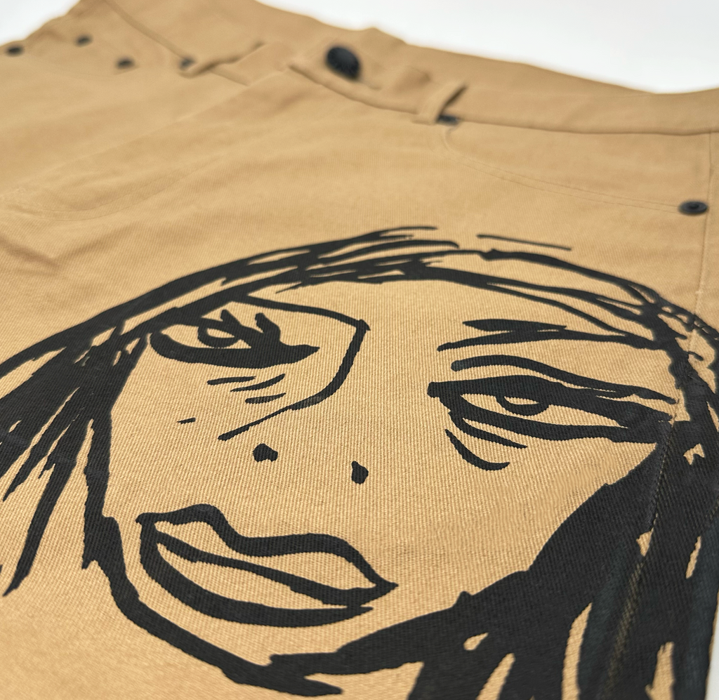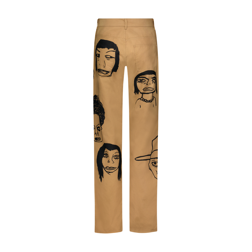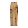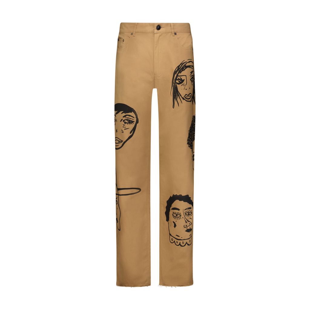 Camel  loose fitting  denim jeans with 8 allover waterbased print original Harif Guzman faces