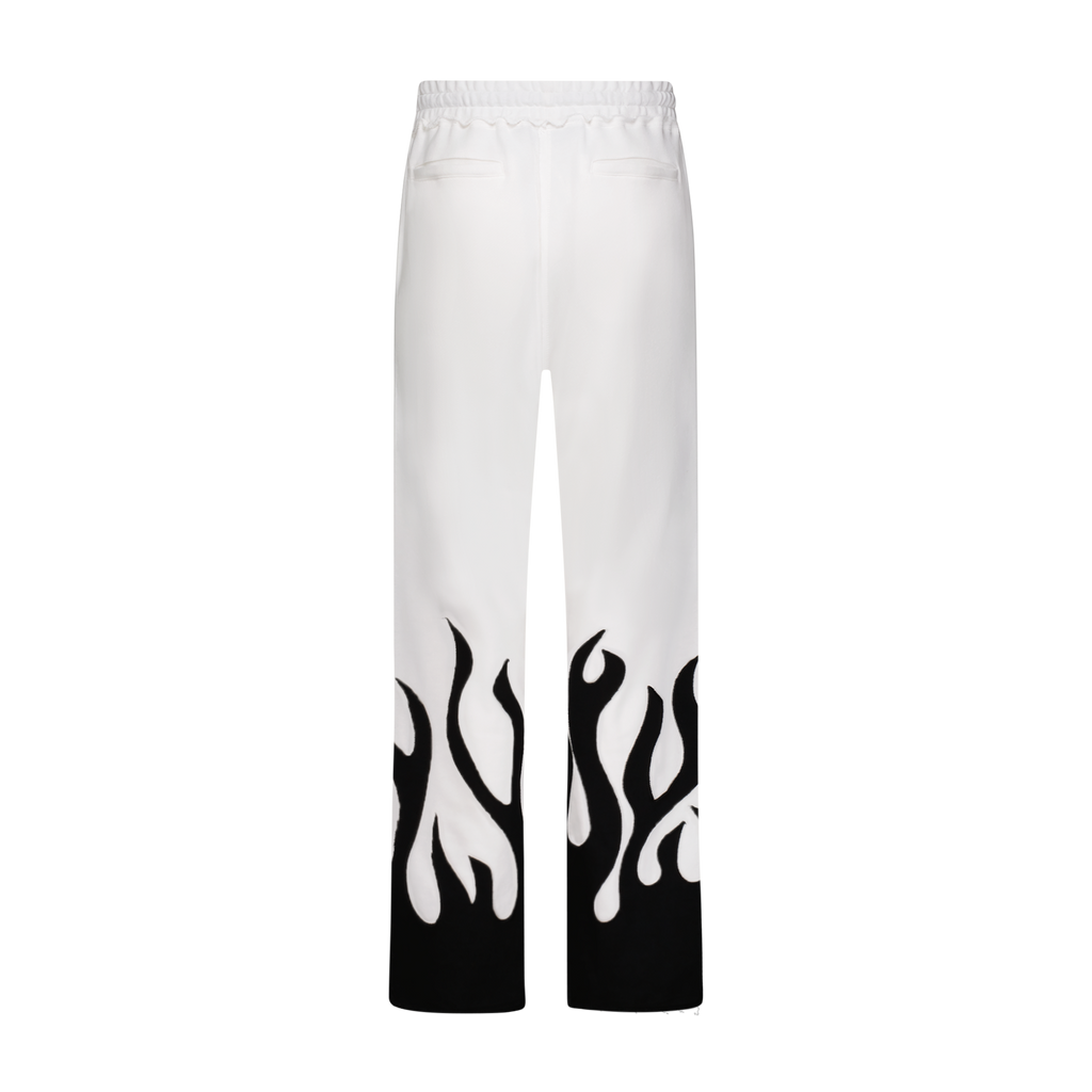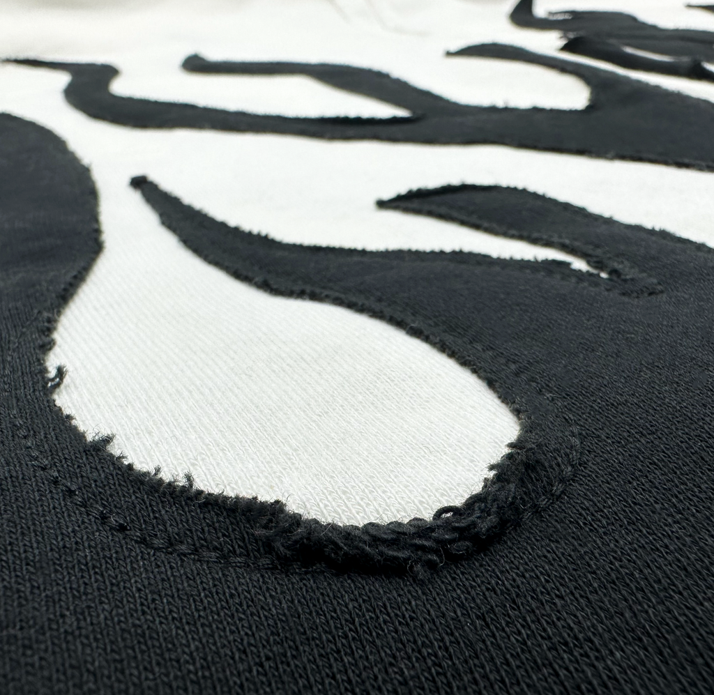 Off-white cotton french terry oversized straight leg pant with raw edge seams and cut and sew black french terry flame