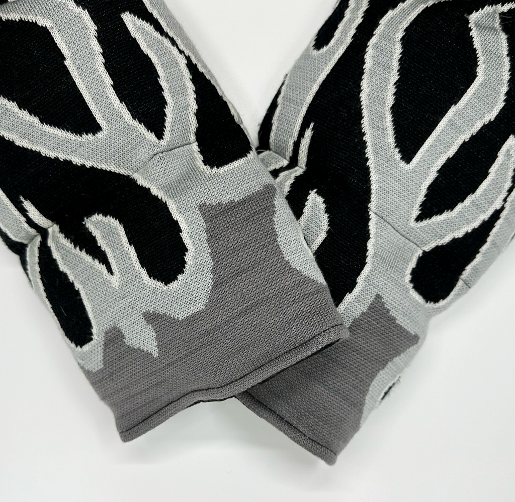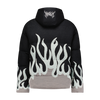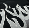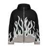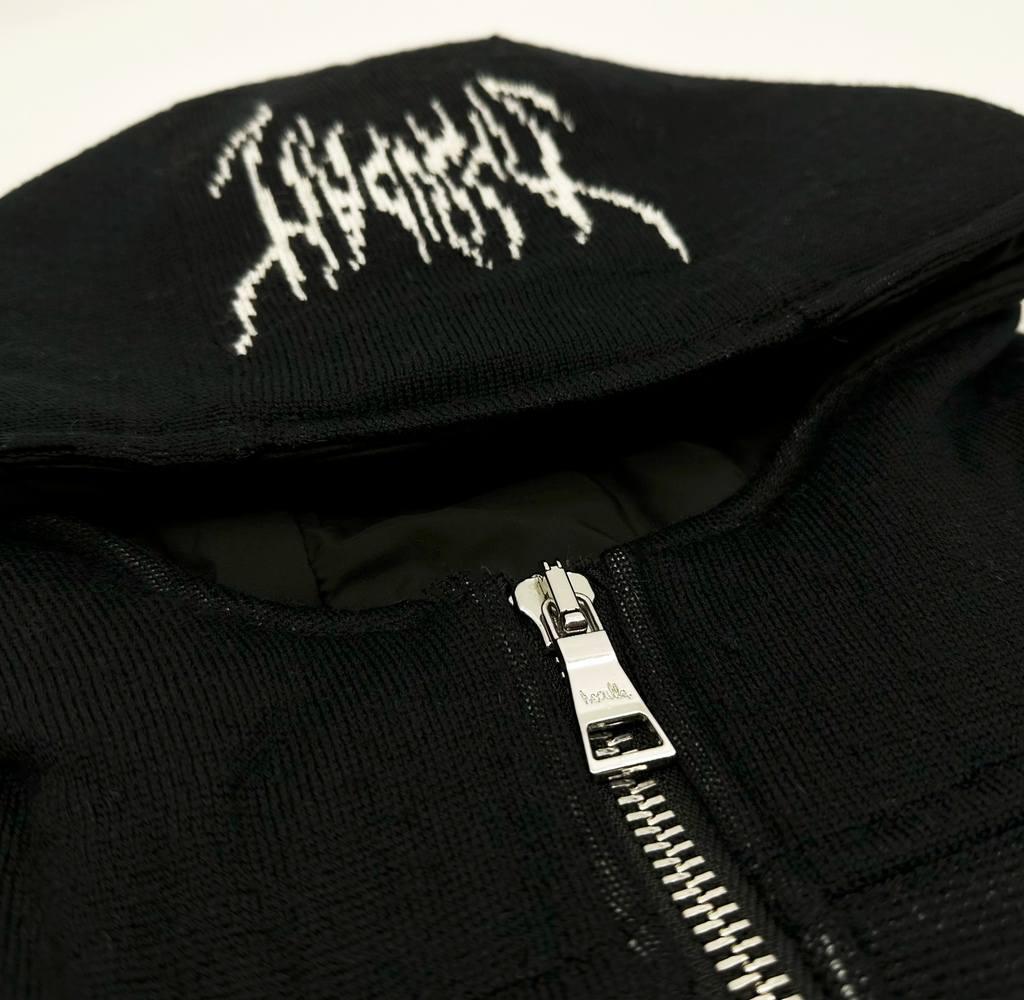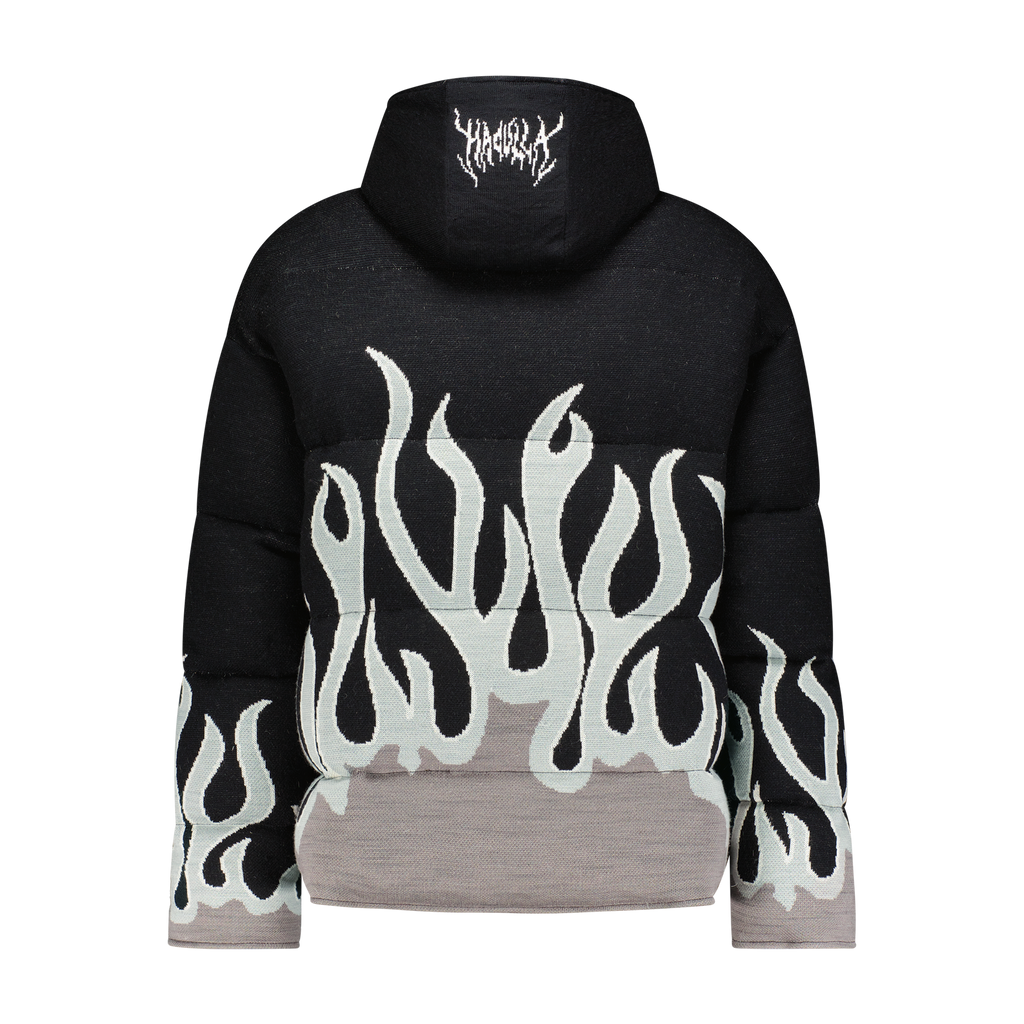 Black knitted wool sweater puffer coat with a black polyester lining, shiny silver 2 way closure zipper, off-white "Haculla" jacquard on the hood and a multi colored original Harif Guzman flame along the bottom of the jacket