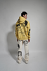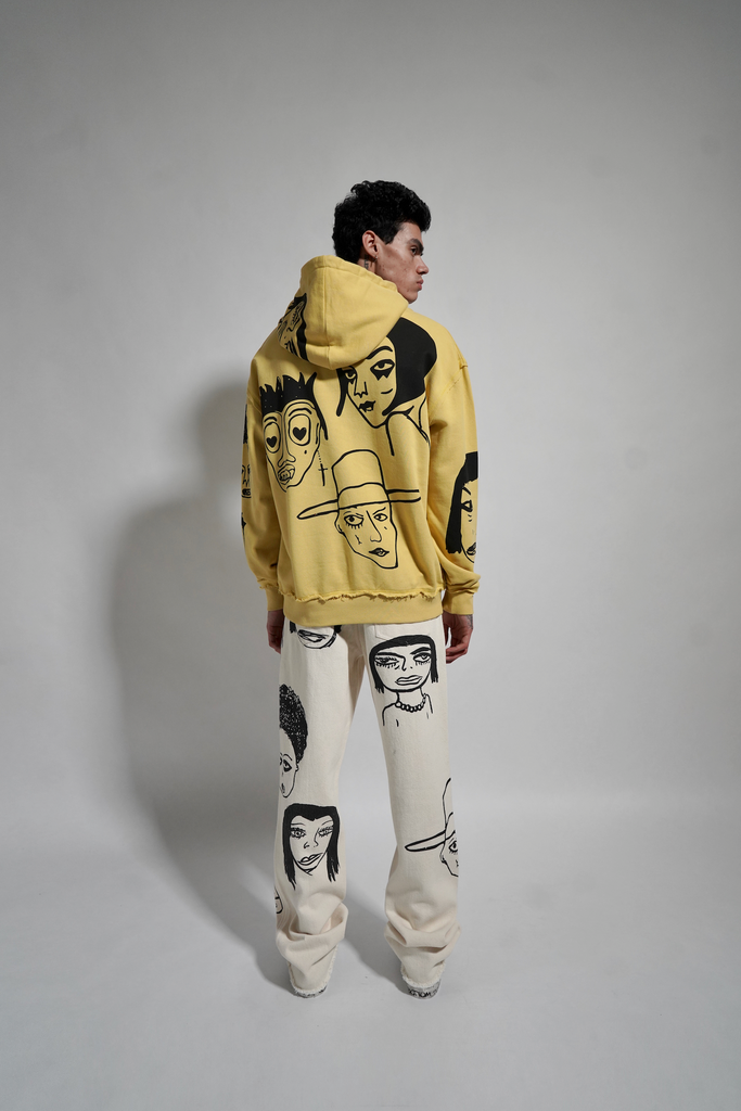 Dusty yellow cotton french terry oversized drop shoulder hoodie with 10 allover waterbased print original Harif Guzman faces