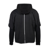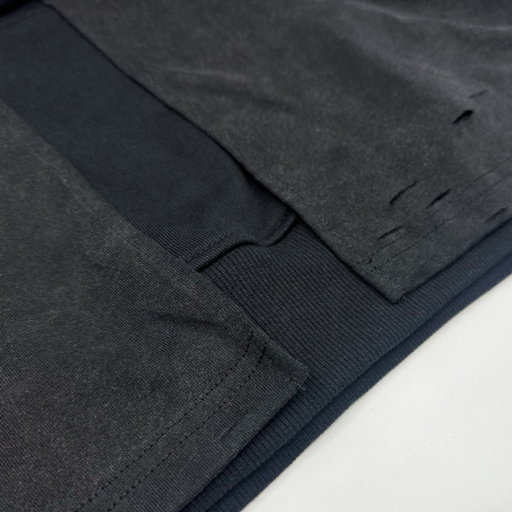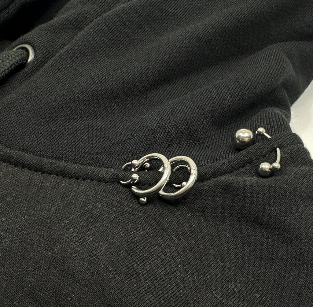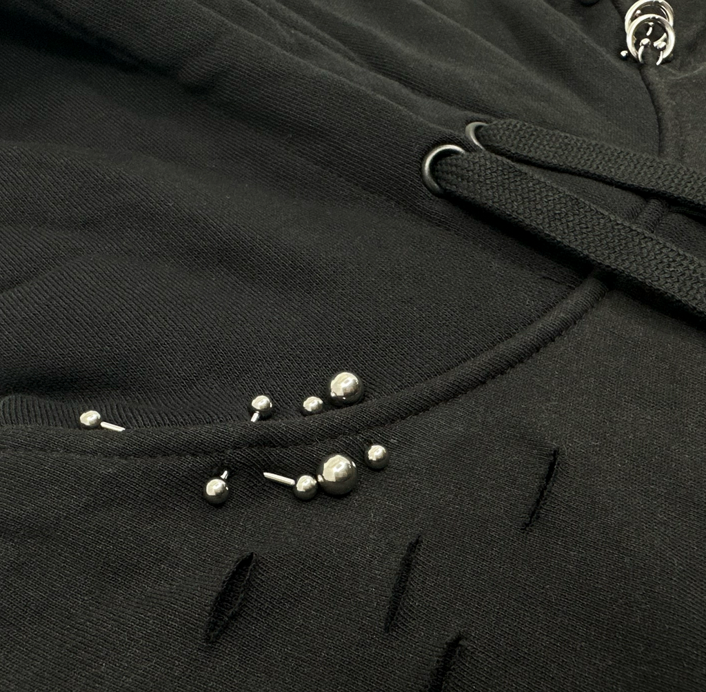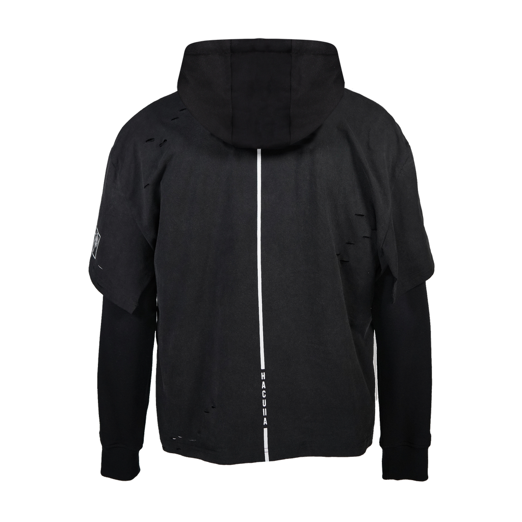 Black cotton french terry oversized, drop shoulder hoodie with a vintage black aged washed cotton tee on with a custom vintage band tee graphic cut down the center on top and silver metal piercing hardware along the seams