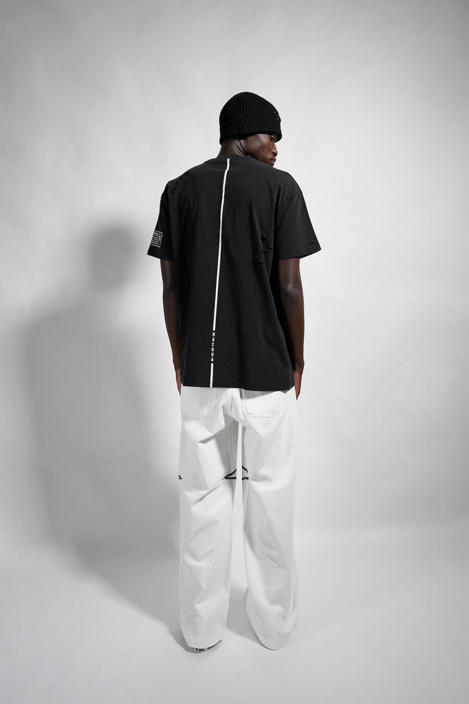 Off-White cotton denim wide leg denim jeans with custom distressed daggers printed on the front knees