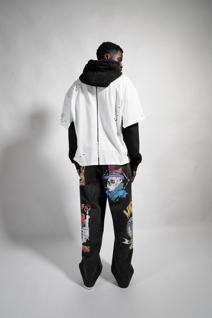 Vintage Black cotton french terry oversized, drop shoulder hoodie with a vintage off-white aged washed cotton tee on with a custom vintage band tee graphic cut down the center on top and silver metal piercing hardware along the seams