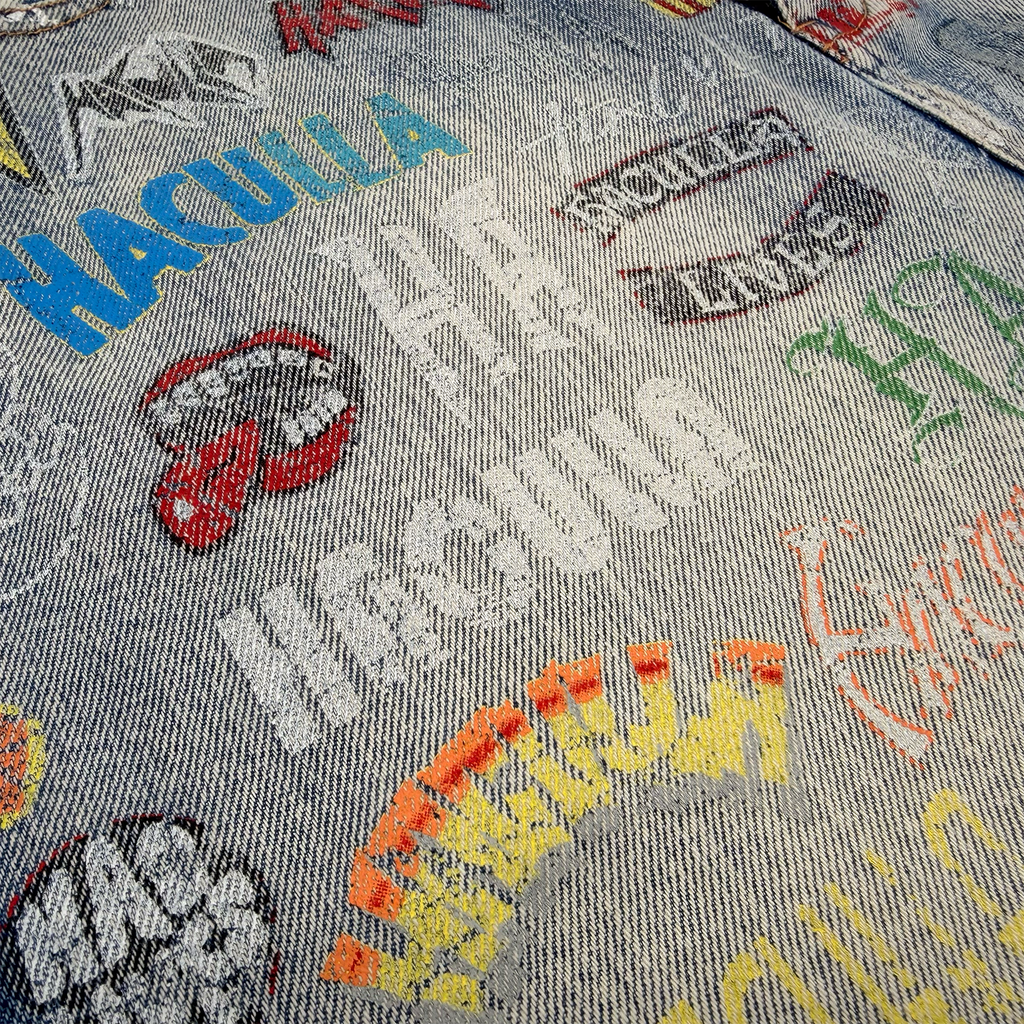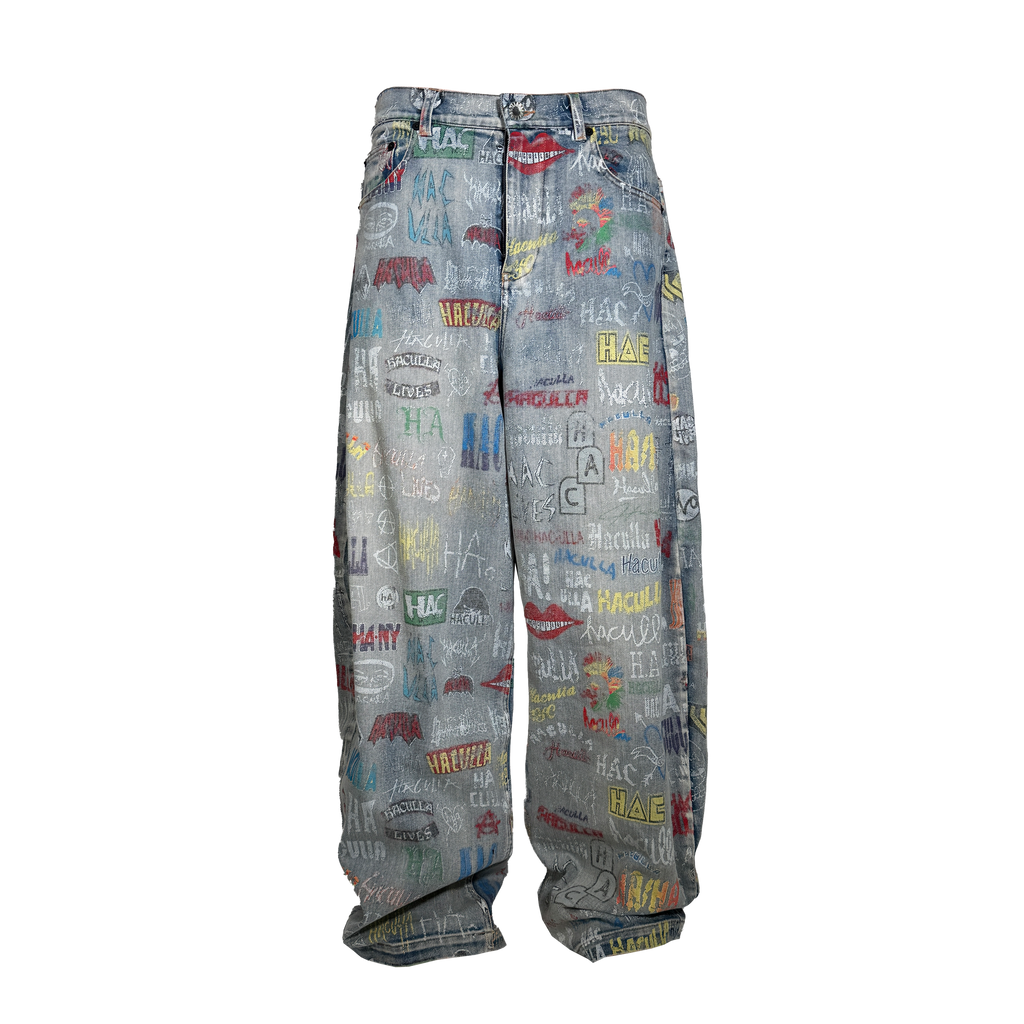 Blue wash cotton denim in an extra oversized, wide leg, baggy jean with branded shank front fastening and a repeat allover print of Haculla logos over the last decade, washed and aged