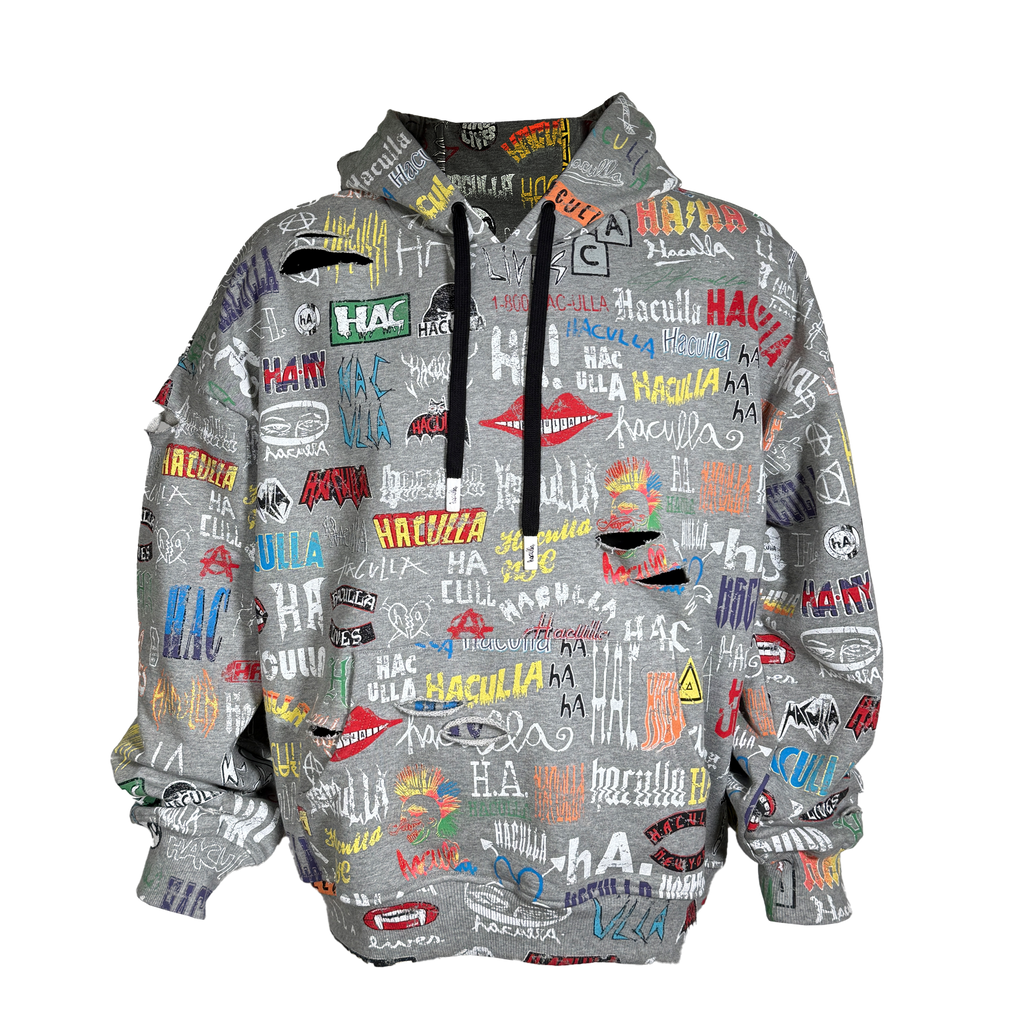 Heather grey cotton french terry extra oversized, drop shoulder, pleated balloon sleeves, ripped and distressed hoodie with repeat allover print of Haculla logos over the last decade, washed and aged