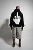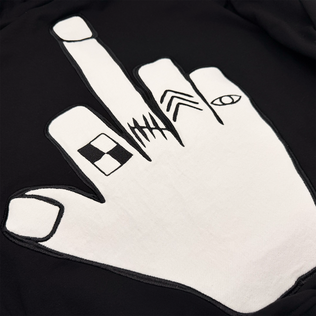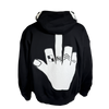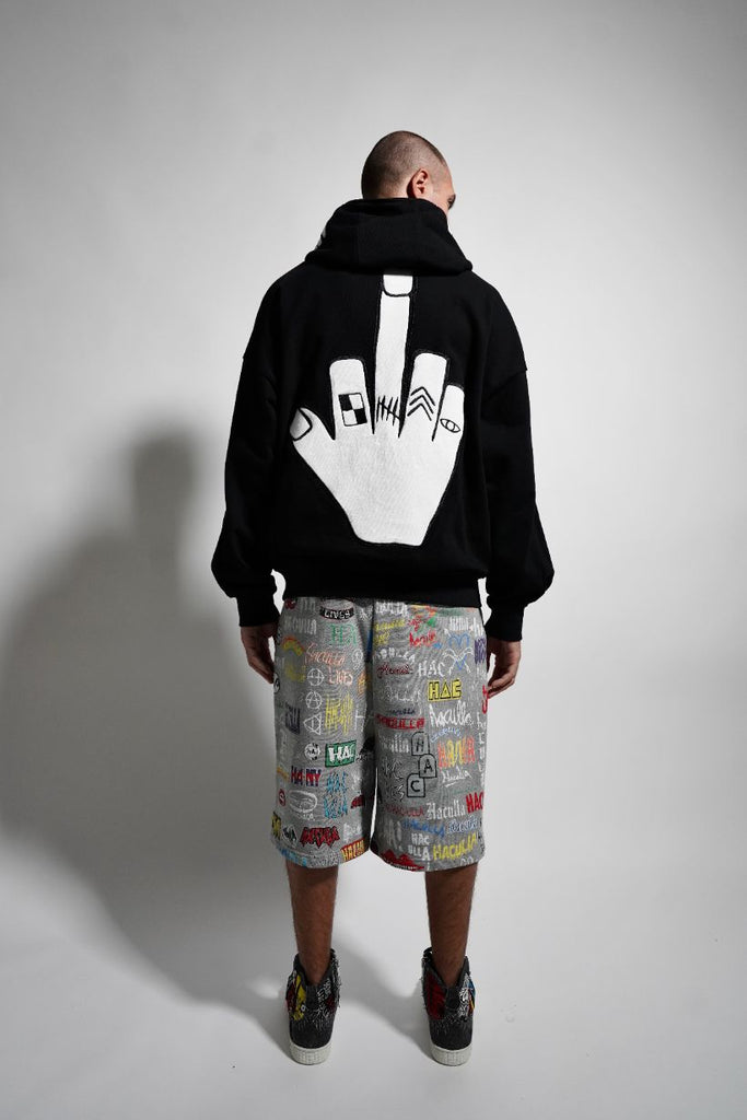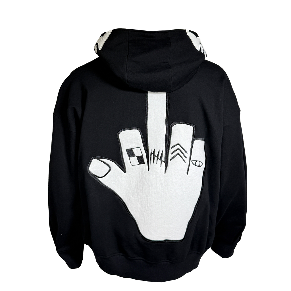 Black cotton french terry extra oversized, drop shoulder, pleated balloon sleeves, full zip-up hoodie with cut and sew original Haculla character on the front of the hood, a direct embroidery on wearers left chest and large cut and sew middle finger on the back