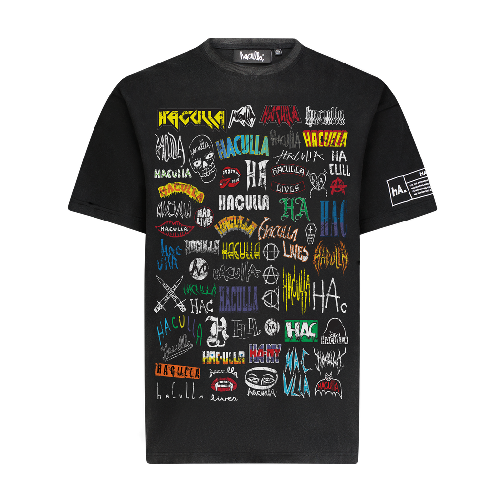 Black vintage washed cotton oversized, drop shoulder t-shirt with a print collage on the front and back of Haculla logos over the last decade, washed and aged