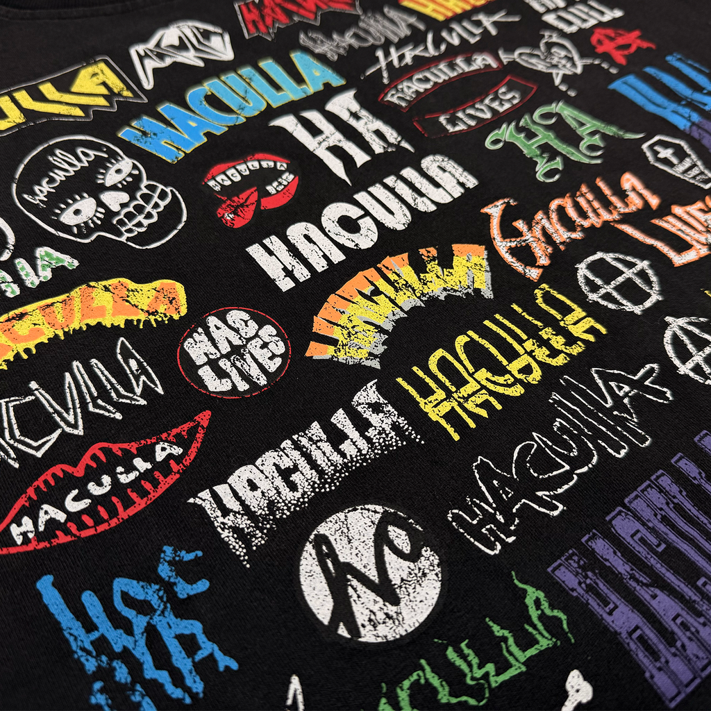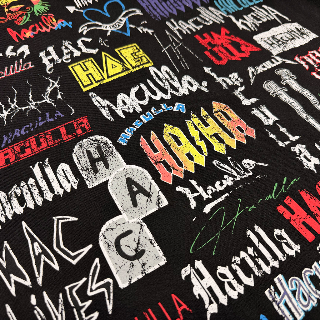 * Collage of various Haculla logo renditions printed on the front chest and back