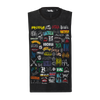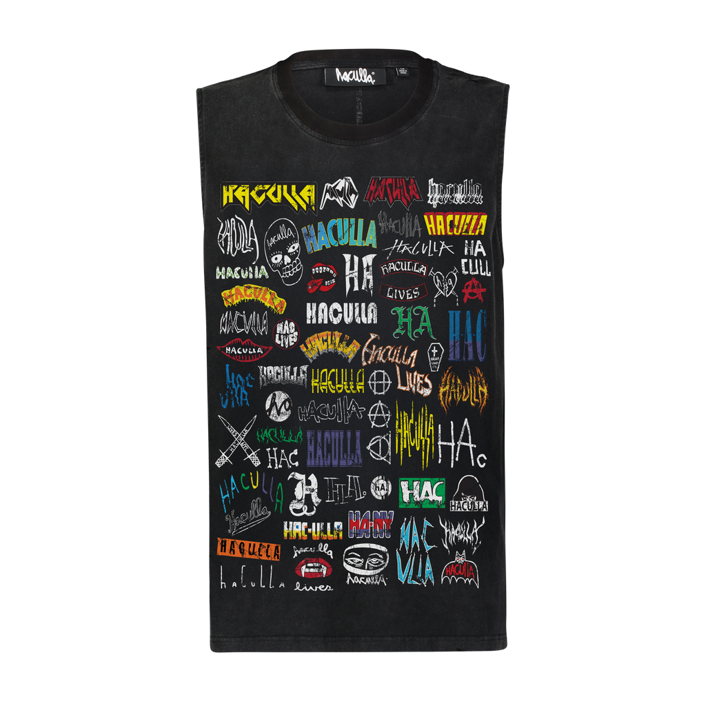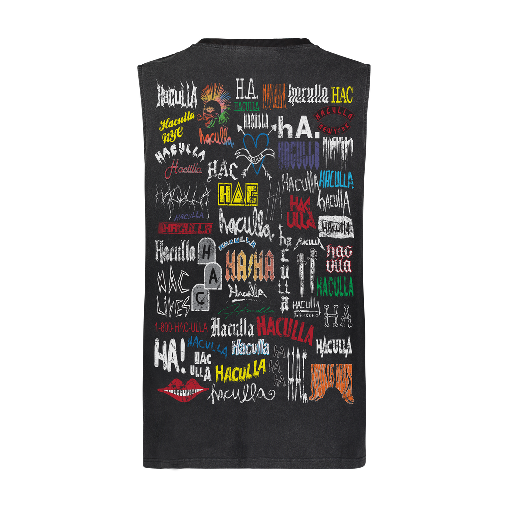 Black vintage washed cotton oversized tank top with a print collage on the front and back of Haculla logos over the last decade, washed and aged