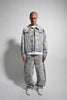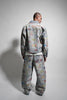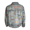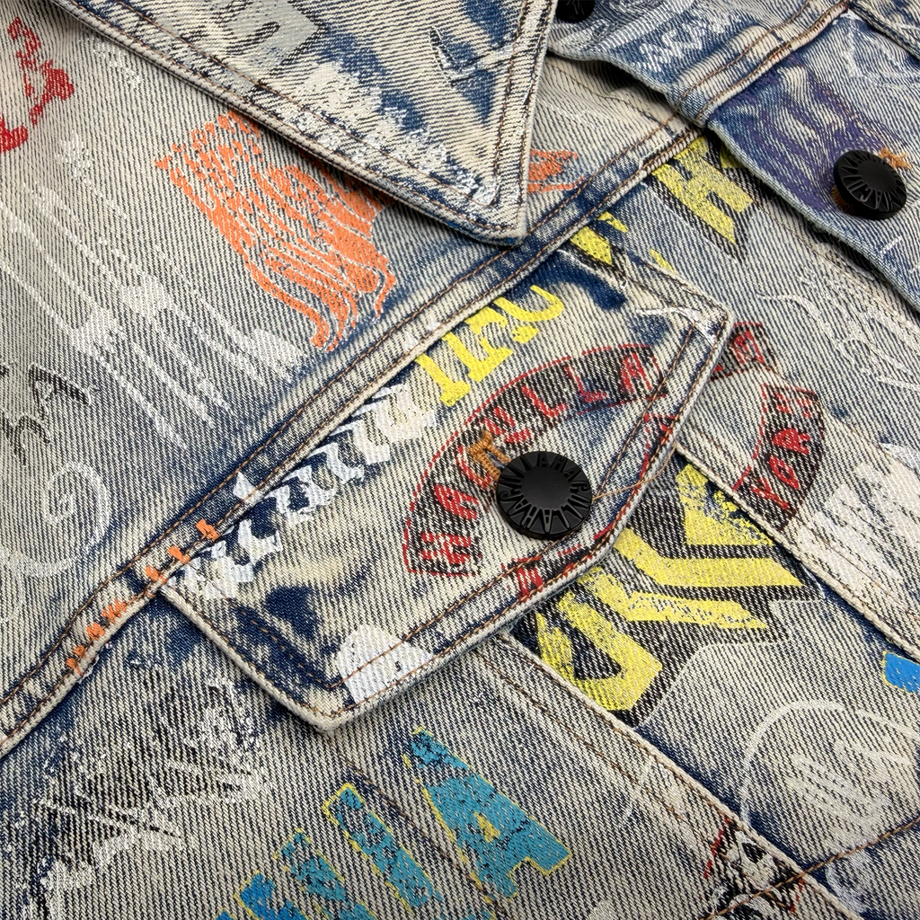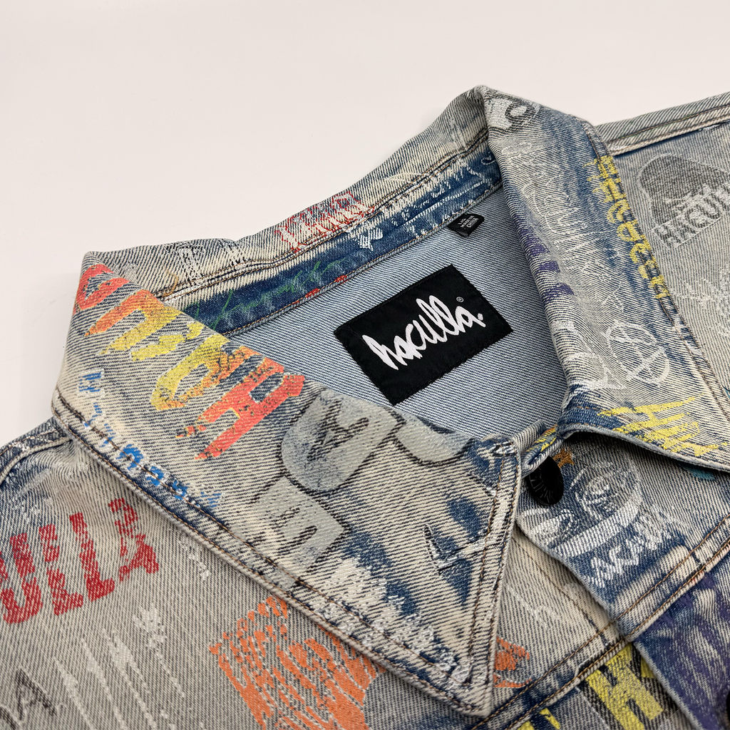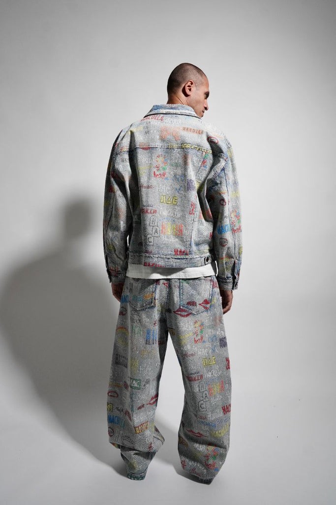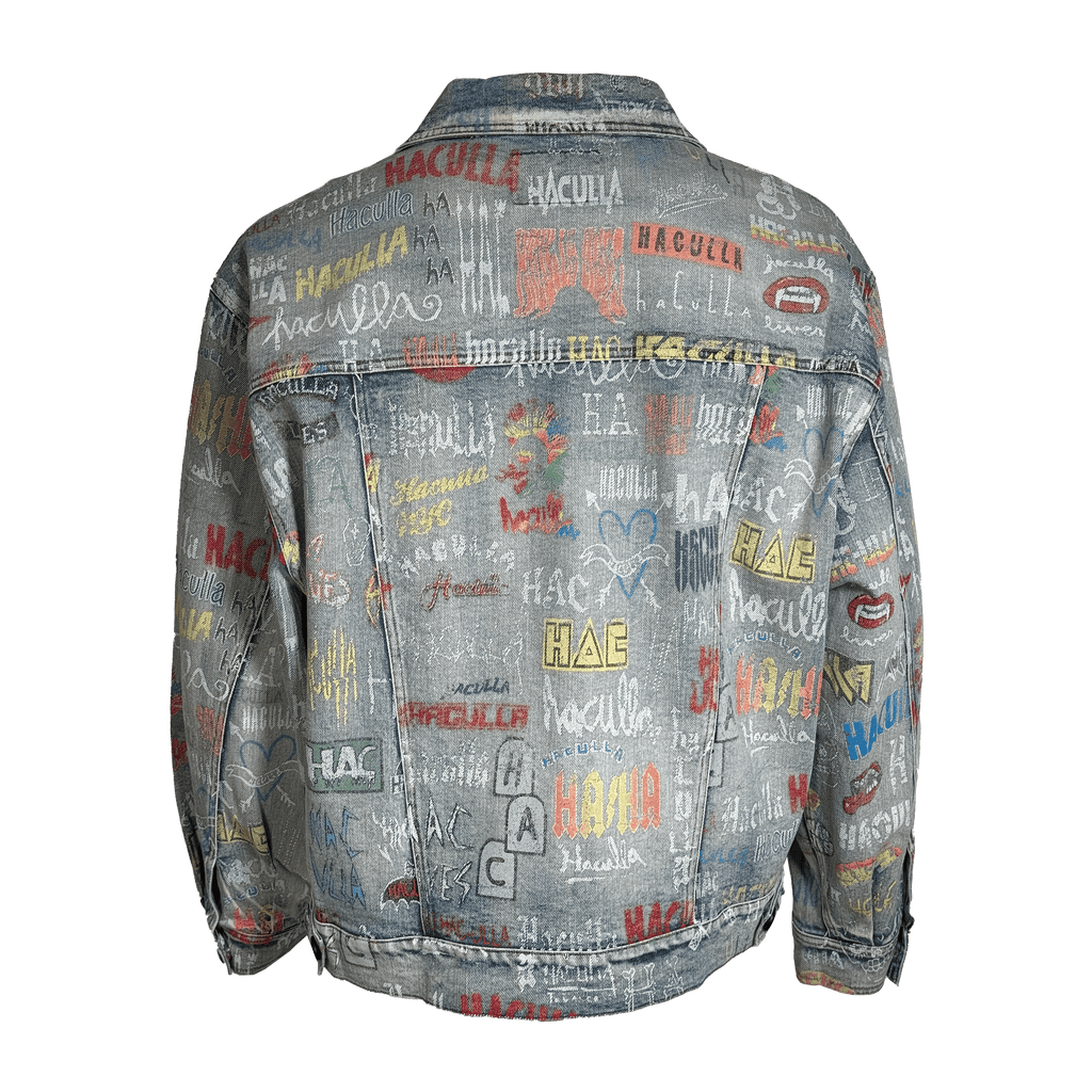 Blue wash cotton denim jacket in an extra oversized, balloon pleated sleeve, denim jacket silhouette with branded front button fastening, and repeat allover print of Haculla logos over the last decade, washed and aged