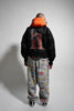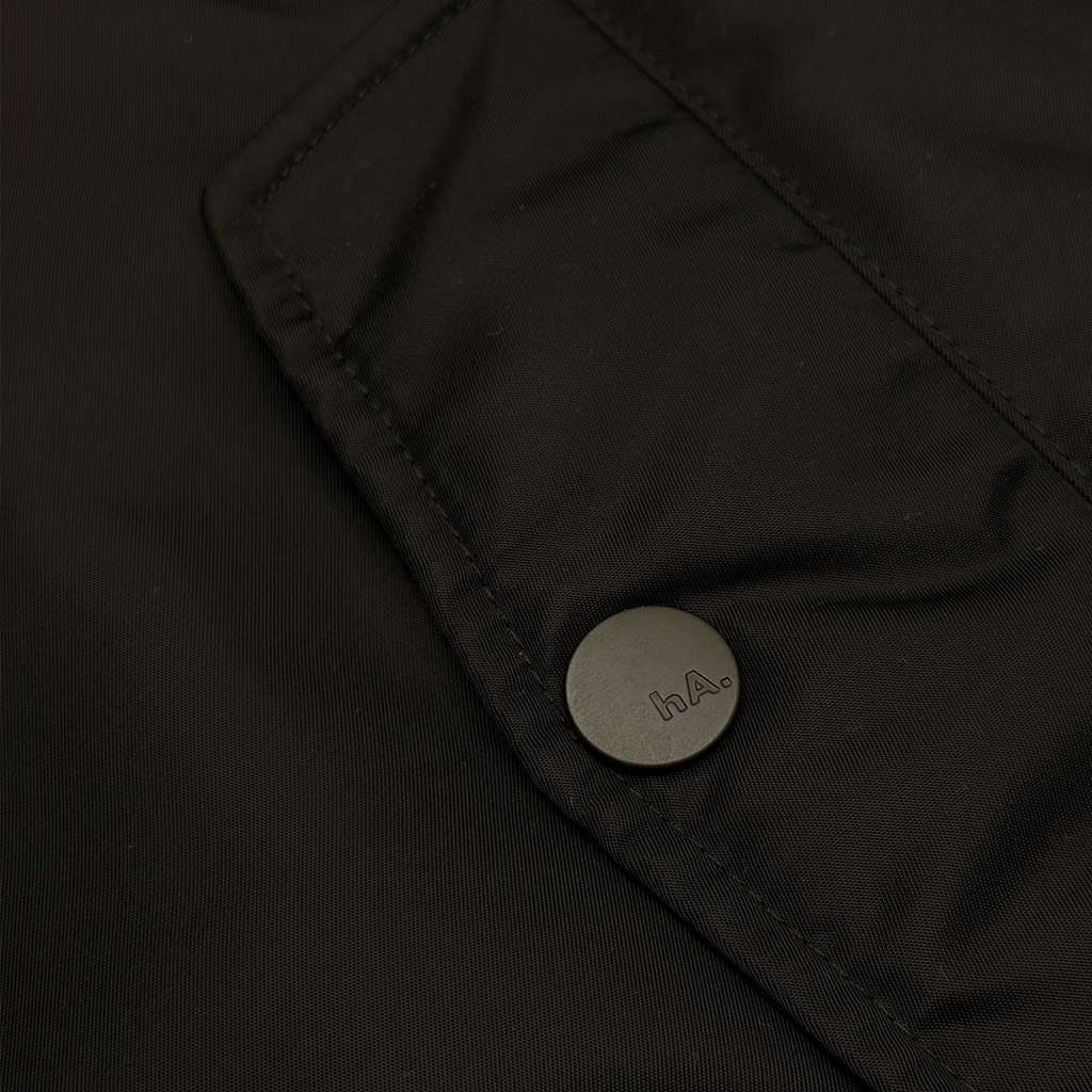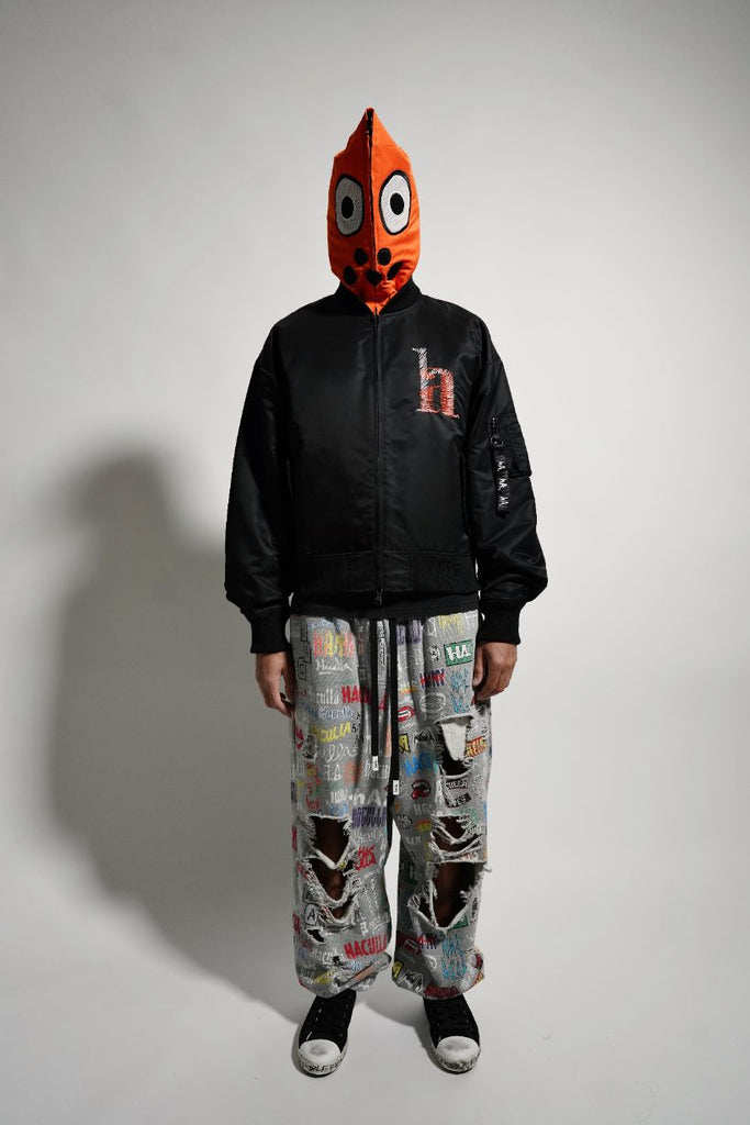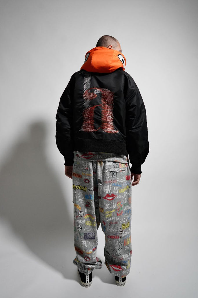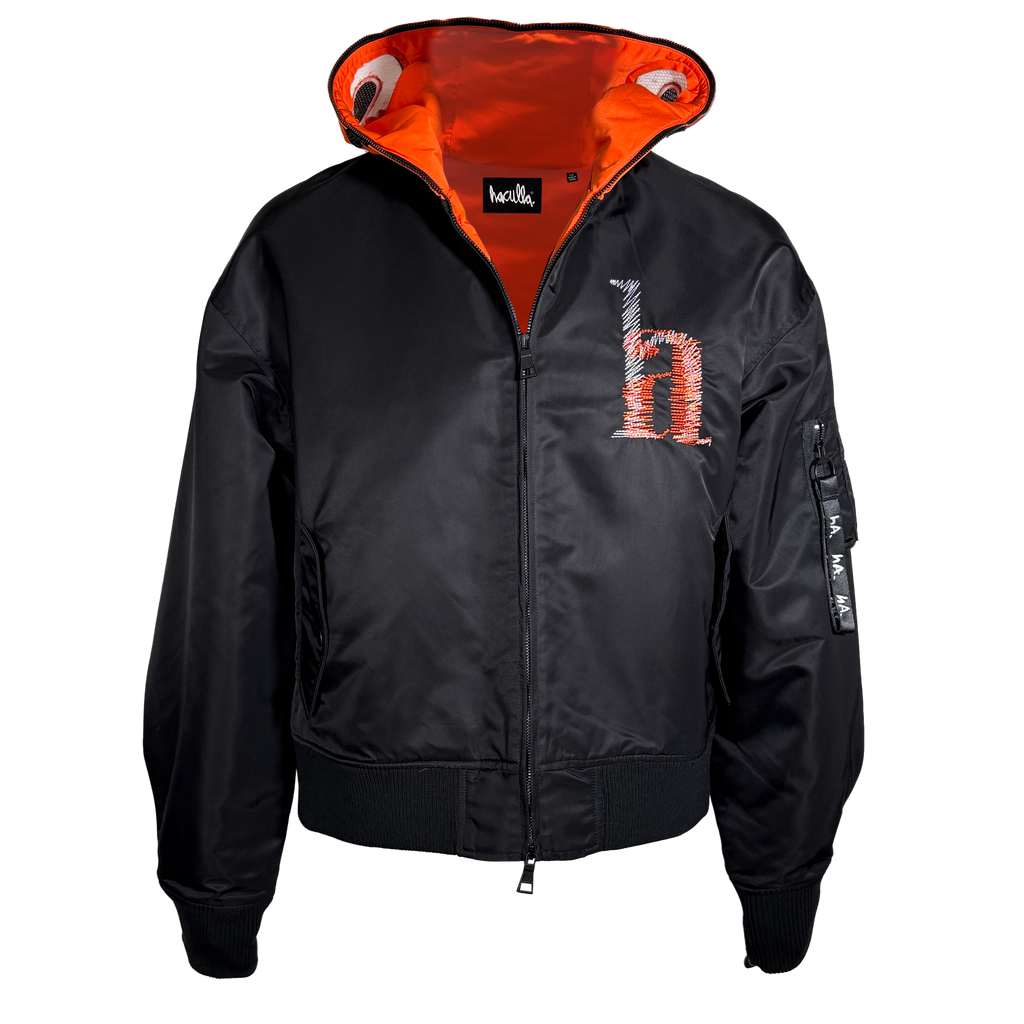 Black eco nylon MA-1 oversized, drop shoulder, balloon pleated sleeves bomber with full zip up orange eco nylon hood with orange acetate lining, a cut and sew original Haculla character on the front, that has visible eye holes, zip MA-1 patch pocket, branded zipper puller, front flap pockets with snap closure, a "ha" scribble direct embroidery on wearers left chest and large direct embroidery on the back