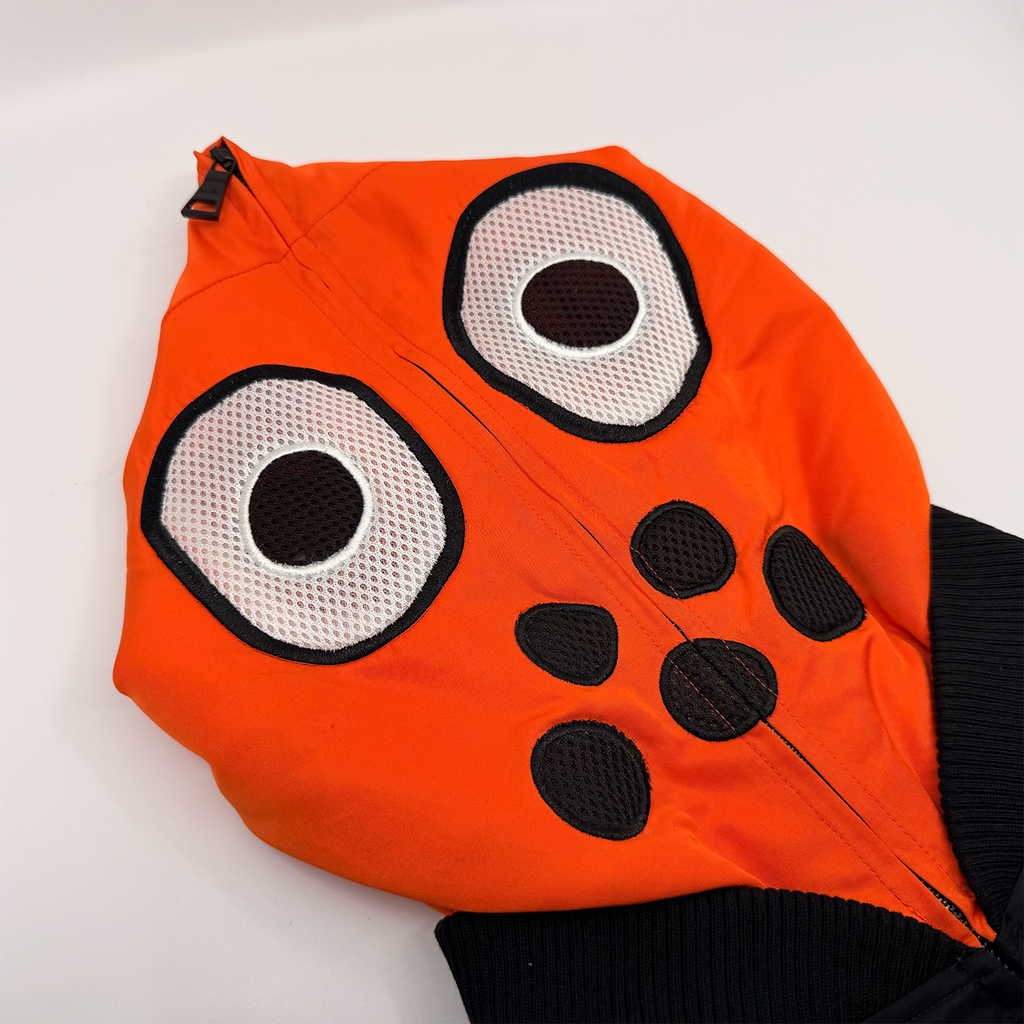 * Cut and sew orange monster artwork on the hood, with mesh eyehole for wearer to see out of