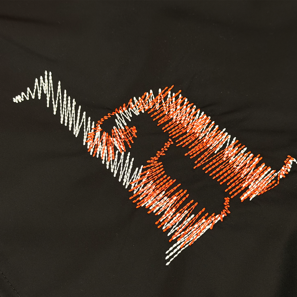 * Direct embroidery on wearers left chest and back of overlapping scribble "ha"