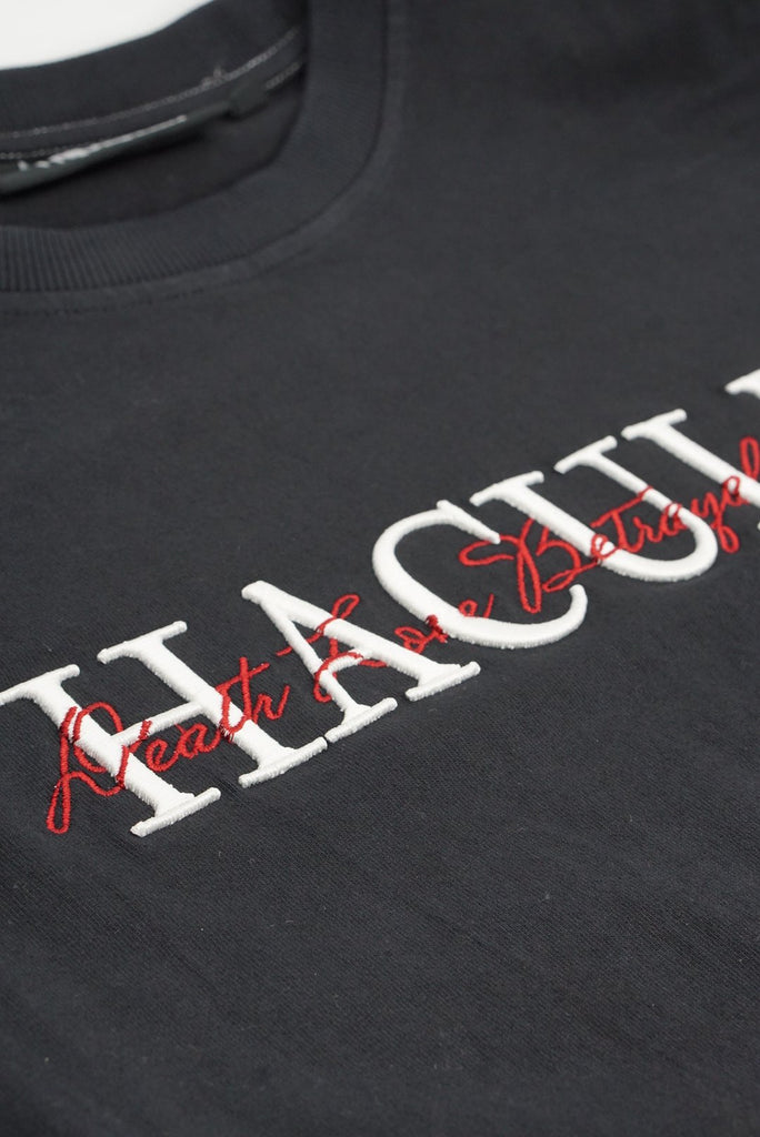 Black cotton french terry with specialized double layered embroidery "Haculla Script" on the front and "Gothic" chainstitch embroidery on the back of an over-sized deconstructed drop shoulder crewneck with exposed and fraying seams