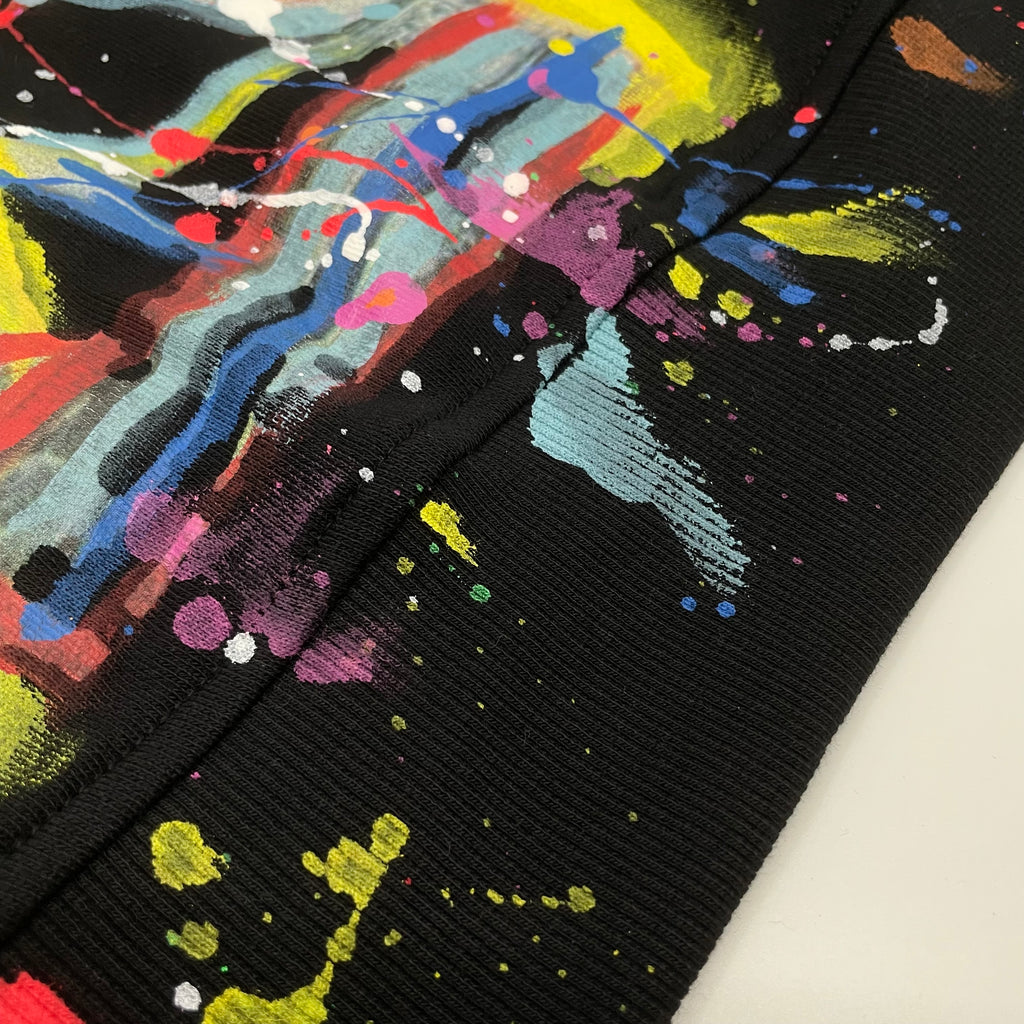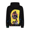Black cotton french terry oversized drop shoulder hoodie with off-white glitched "Haculla" 3D embroidered left chest hit and hand-painted "Blonde" artwork on the back artisanal hand-painted finish