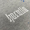 Heather Grey cotton french terry oversized drop shoulder hoodie with off-white glitched "Haculla" 3D embroidered left chest hit, hand-painted "Hac-Man" artwork on the back and artisanal hand-painted finish